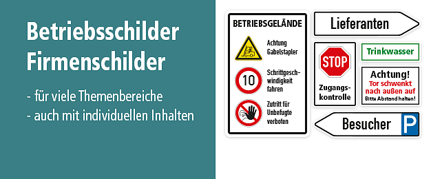 Weitere Schilder zur Betriebskennzeichnung finden Sie z.B. in den Fachkategorien Sicherheitskennzeichnung, Parkplatzschilder, Brachen- und Themenschilder sowie Verkehrsschilder.
