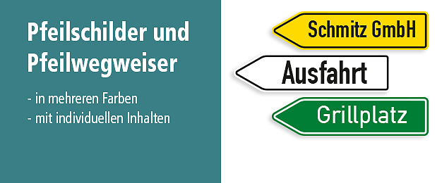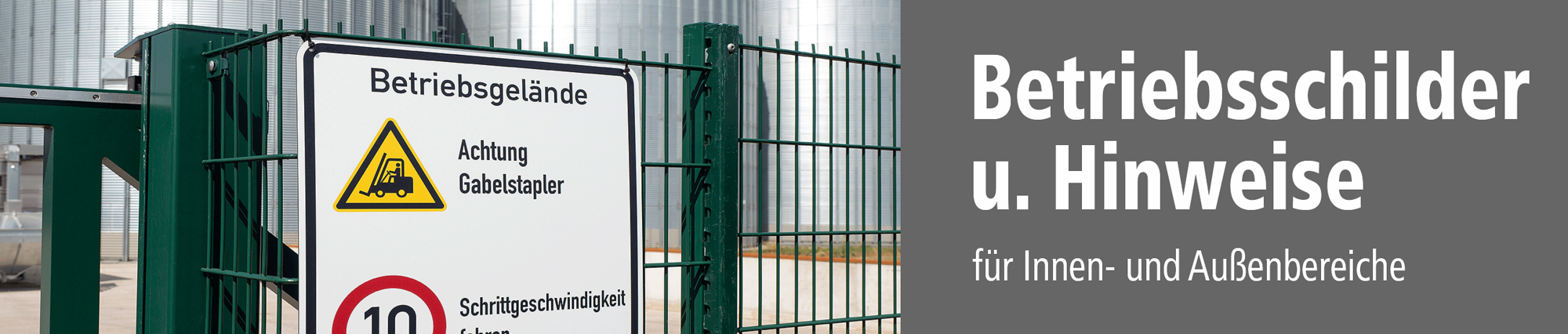 In der Kategorie Betriebsschilder und Hinweise finden Sie allgemein gebräuchliche Schilder rund um die Unternehmensbeschilderung wie auch Kennzeichnungen für das Büro oder die Werkstatt. Dies schließt Pfeilschilder zur Wegkennzeichnung in vielfältigen Ausführungen ein, aber auch Betriebsschilder für Betriebsgelände, die im Außen- und Innenbereich auf eventuelle Videoüberwachung hinweisen, Unbefugte in Kenntnis setzen, dass der Zugang verboten ist oder Passanten und Verkehrsteilnehmer mit Sicherheitsschildern oder Verkehrsschildern für Gefahren sensibilisieren. So können diese Gefahren z.B. vom Werksverkehr / Gabelstaplerverkehr oder einer für Außenstehende unklaren Verkehrsregelung ausgehen.