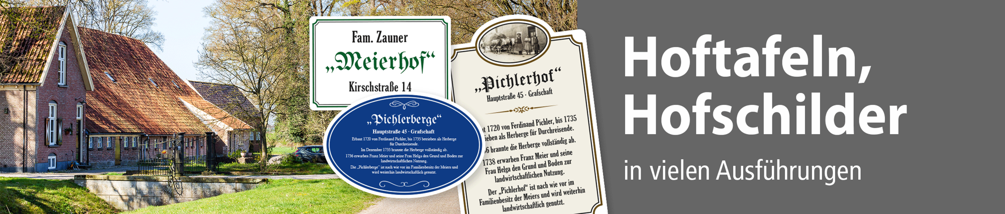 Unsere hochwertigen Hoftafeln werden aus 2 mm Hartaluminium oder aus 3 mm Aluminium-Verbundmaterial gefertigt, sie sind wetterfest und in vielen Größen erhältlich. Alternativ bieten wir die Hoftafeln auch als schöne Hausschilder an – mit Ihrem Hofnamen, Ihrer Adresse wie auch der Möglichkeit, alte Aufnahmen Ihres Hofes einzubinden.