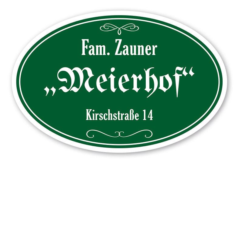 Merkmale des Hofschildes / der Hoftafel mit Familien- und Hofnamen sowie Adresse - ovale Ausführung in vier Farbvarianten - HF-TF-01: