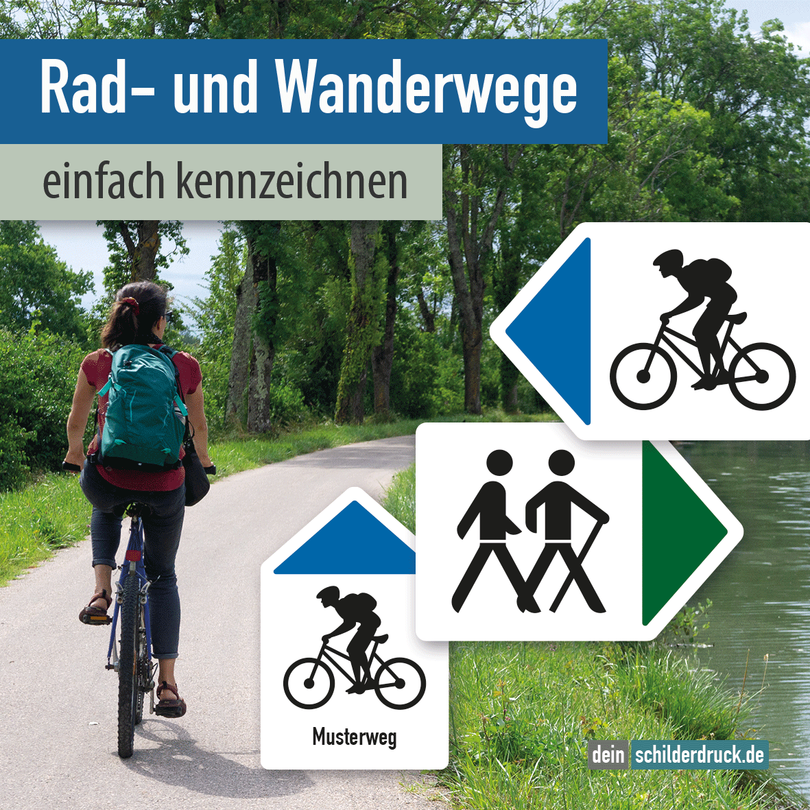 Kennzeichnen Sie Radwege, Mountainbike-Strecken und Wanderwege einfach und preiswert. Unsere Schilder sind in diversen Richtungsausführungen und Farbvarianten erhältlich. So können Sie diese Schilder nur mit dem eindeutigen Symbol oder mit einem zusätzlichen Texthinweis bestellen, um die Strecke, den Weg oder ein Endziel zu benennen. Alle unsere Schilder für Rad- und Wanderwege sind gleich aufgebaut, so dass sie beliebig miteinander kombiniert werden können. Die Fertigung erfolgt aus einem stabilen Aluminiumverbundmaterial in 3 mm Stärke, der Druck im hochwertigen Digitaldruck. Alle Schilder sind langlebig und bestens für den Außenbereich geeignet.