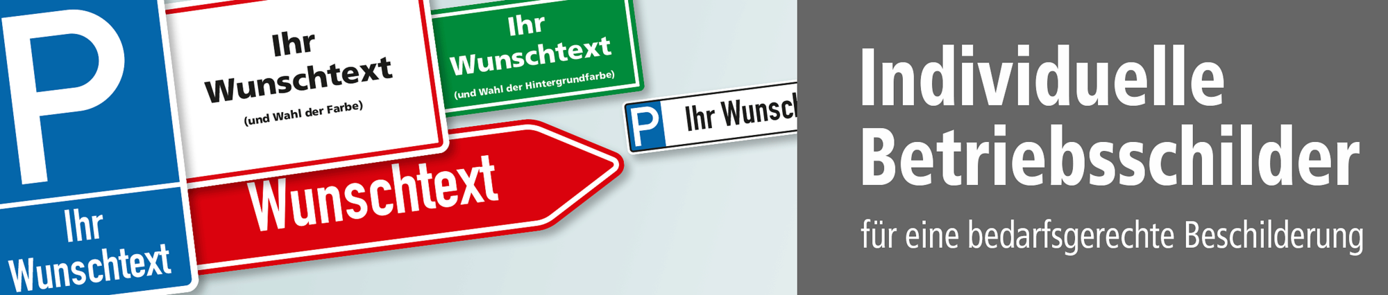 Obwohl sich die meisten Artikel direkt auf ihren Artikelseiten textlich anpassen lassen, bieten wir Ihnen in dieser Kategorie einige rein individuelle Schilderartikel an, darunter Textschilder mit verschieden farblichen Rahmen, Pfeilschilder in mehreren Farbvarianten und Parkplatzschilder für ein- oder mehrzeilige Textinhalte. Diese Schilder sind in mehreren Größen erhältlich, um eine gute Sichtbarkeit aus jeder Entfernung sicher zu stellen. Die Ausführung der Schilder ist standardmäßig weiß, kann aber auch in reflektierenden Varianten bezogen werden. Sie wünschen ein Schild in einer anderen Größe oder Farbvariante? Fragen Sie uns. Wir fertigen Schilder nach Ihren Vorgaben, auch in Sondergrößen. Gerne unterbreiten wir Ihnen unser Angebot.
