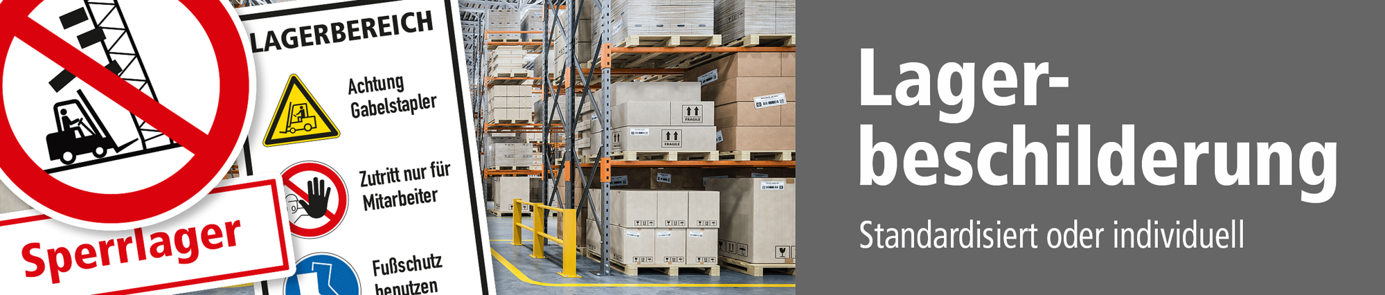 In der Kategorie Lagerbeschilderung führen wir eine Reihe allgemein gebräuchlicher Schilder für Lager- und Versandbereiche, die jeweils als Standardartikel oder mit Ihren Textinhalten individualisiert erhältlich sind. Die Themenbereiche reichen von Warnschildern, z.B., Nicht mit dem Gabelstapler gegen Regale fahren, über Schilder zur Lagerzugangsberechtigung bis hin zur Sicherheitskennzeichnung in vielfältiger Form wie Sicherheitsschilder, genormte Verbots- und Warnhinweise sowie Verkehrsschilder nach StVO oder in praxisbewährten Ausführungen.
