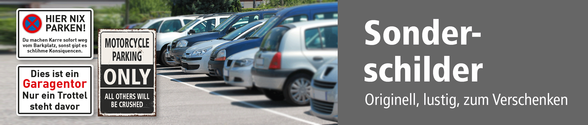 In dieser Kategorie halten wir für Sie normfreie Parkplatzschilder und Parkplatzhinweise der etwas anderen Art bereit, mit lustigen oder originellen Inhalten – zum Verschenken oder für den Eigengebrauch, ganz wie Sie mögen. Weitere Schilder dieser Art finden Sie auch in der Rubrik Dekoschilder / Fun-Schilder.