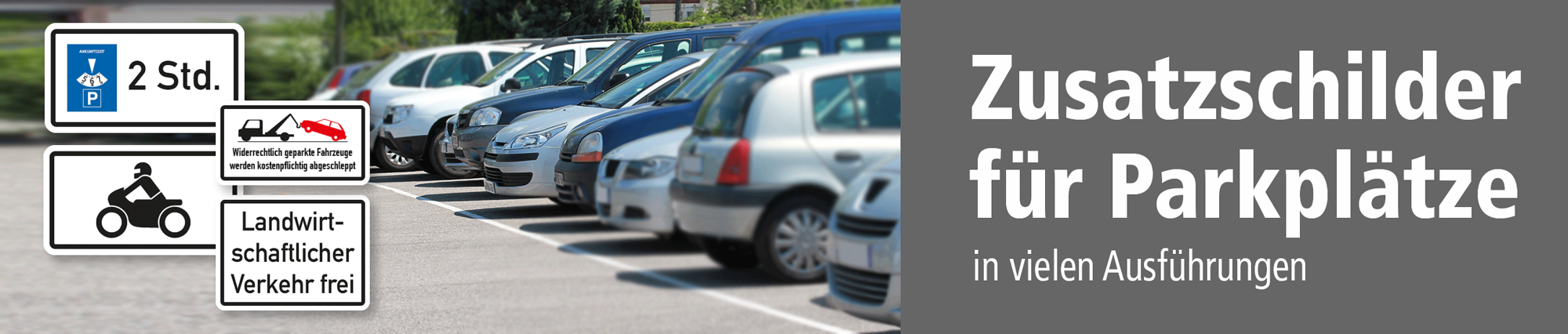 Als Zusatzschilder oder Zusatzzeichen werden Schilder bezeichnet, die in Kombination mit Parkplatzschildern und Verkehrszeichen als ergänzende Informationsträger eingesetzt werden. Einige Zusatzzeichen erfordern zwingend diese Kombination, da sie sich auf das Hauptschild beziehen, die meisten Zusatzschilder sind jedoch auch als Einzelschilder einsetzbar. Alle Texte auf unseren Zusatzschildern können ergänzt oder gänzlich durch eigene Inhalte ersetzt werden.