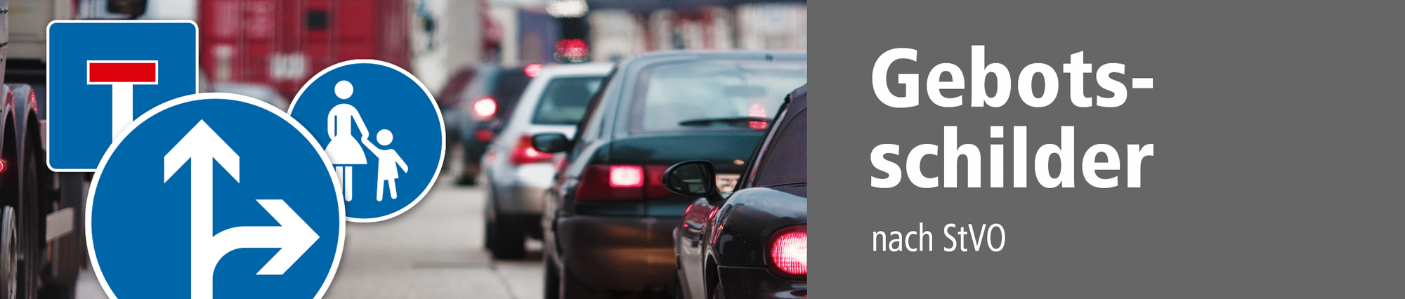 Vorschriftszeichen bzw. Gebotsschilder sind Verkehrsschilder, die mit Geboten und Verhaltensweisen die Sicherheit im öffentlichen wie auch betrieblichen Straßenverkehr regeln. Dies erfolgt in der Regel mit runden, aber auch rechteckigen, blauen Verkehrszeichen mit weißen Symbolen. Diese Symbole können Pfeile zur vorgeschriebenen Fahrtrichtung darstellen, aber auch Fahrzeuge – z.B. ein Fahrrad, das einen Fahrradweg auszeichnet. Gebotszeichen gelten ab der Aufstellung bis zu ihrer Aufhebung oder anderen Schildern, die eine neue Verkehrsregelung vorsehen. Wir führen die gängigsten Gebotsschilder als einzelne Verkehrszeichen.