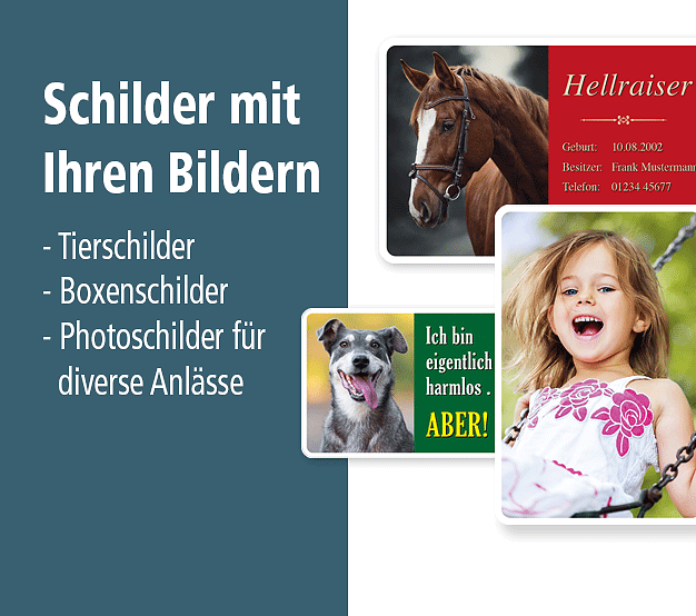 Soll es hingegen nicht der Retrostil sein, produzieren wir selbstverständlich auch natürliche Photoschilder im Hoch- oder Querformat mit Ihren individuellen Bild- und Textinhalten – mit Ihren Tierphotos, Familienbildern, Urlaubsphotos u. a. – zum Aufstellen oder Aufhängen, als hochwertige Dekoschilder, Hundeschilder für Ihr Gartentor oder als Boxenschilder im Pferdestall. Den Möglichkeiten sind keine Grenzen gesetzt.