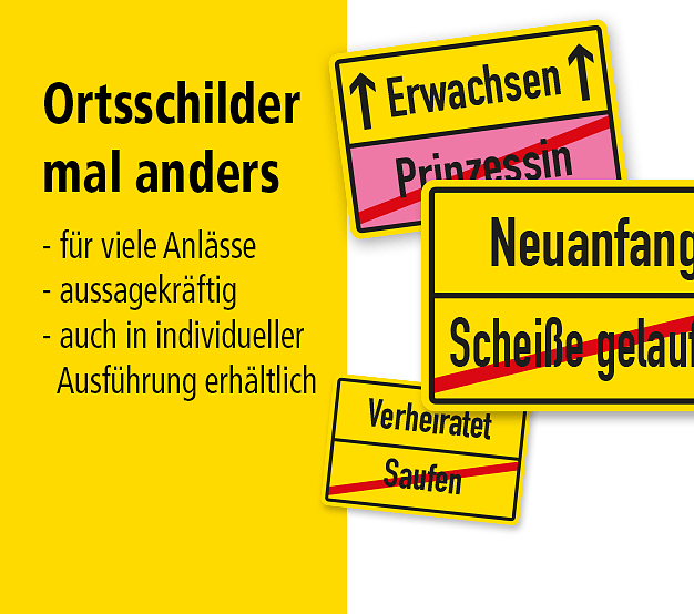 Die Schilder in der Kategorie Dekoschilder - Funschilder sind in zahlreichen Größen und Ausführungen erhältlich – als Standardartikel oder in individuellen Ausführungen mit Ihrem Wunschtext, sofern dies von uns vorgesehen wurde. Textänderungen lassen sich direkt über die Artikeldetailseiten vornehmen – einfach im zuständigen Eingabefeld eingeben und bestellen. Wir schicken Ihnen dann eine Korrektur zur Ansicht, die Sie freigeben müssen. Sollten Sie Fun-Schilder in unserem Online-Shop vermissen, bitten wir um Nachricht. Wir fertigen lustige und originelle Schilder auch nach Ihren Wünschen. Gerne unterbreiten wir Ihnen unser Angebot. Anregungen zur Erweiterung unseres Schildersortiments sind uns willkommen.