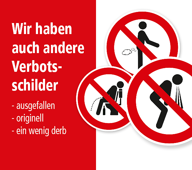 Für Liebhaber des derberen Humors bieten wir eine Reihe lustiger Schilder in Form von Verkehrszeichen und Verbotsschildern in Originalausführung, jedoch mit ausgefallenen Inhalten, wie auch keinesfalls normgerechte Brandschutzzeichen an. Die Themenverfügbarkeit dieser Schilder ist so vielfältig wie der jeweilige Verwendungszweck, doch eines ist garantiert: zu Hause oder am Arbeitsplatz, auf Partys, Junggesellen- oder Schützenfesten sorgen unsere spaßigen Verkehrs- , Verbots- und Brandschutzzeichen für Aufsehen und reichlich Gelächter.