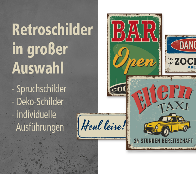 Bitte beachten Sie, dass die Alters- und Abnutzungserscheinungen auf unseren Retro- und Vintage-Schildern nur aufgedruckt sind. Alle Schilder werden bestellbezogen produziert und verlassen neuwertig unser Haus.