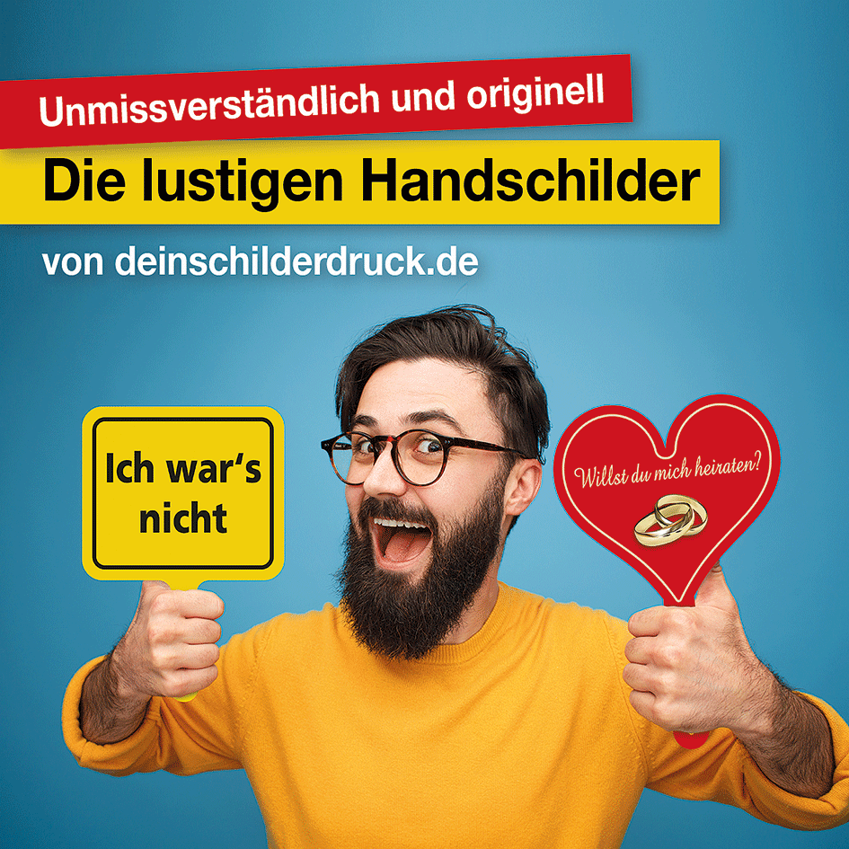 Formschilder oder Handschilder sind formgefräste Schilder mit einem praktischen Handgriff, um bei Bedarf schnell und unmissverständlich seine Emotionen, Wünsche oder Meinungen kundzutun. Unsere Handschilder sind mit reinen Textinhalten oder Abbildungen erhältlich, die aufgrund ihrer Symbolik keine weiteren Erklärung bedürfen. Benutzen Sie Formschilder im Büro, auf Hochzeiten oder Partys – mit dieser auffälligen Art der Komunikation bringen Sie die jeweilige Aussage in der Regel zur allgemeinen Belustigung auf den Punkt. Unsere Handschilder sind in zahlreichen Standardausführungen und jeweils zwei Größen erhältich, können aber auch mit individuellen Textinhalten für eine bedarfsbezogene Nutzung erworben werden.