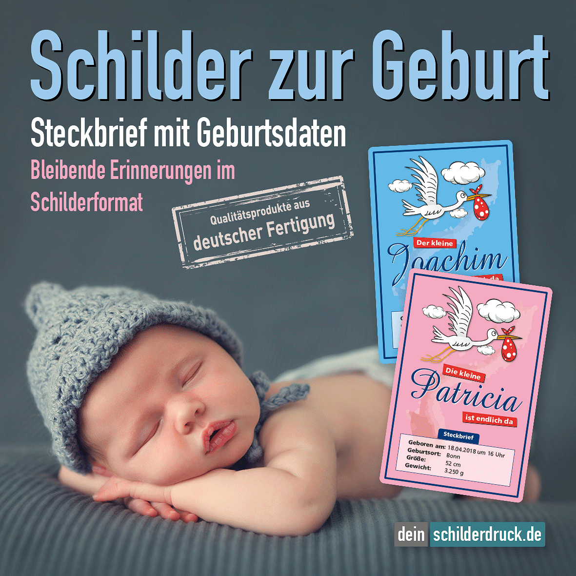 - Dieses schöne Geburtsschild kann mit individuellen Attributen bestellt werden. Geben Sie die Geburtsdaten in das Eingabefeld auf dieser Seite ein. Nach Ihrer Bestellung setzen wir Ihre Wünsche um und übermittelt Ihnen eine Korrekturdatei zur Ansicht. Bitte prüfen Sie die Inhalte dieser Korrektur auf Fehler und erteilen uns, sofern alles in Ordnung ist, unbedingt die Druckfreigabe. Ihr Schild kann erst dann produziert werden, wenn uns Ihre Druckfreigabe vorliegt.