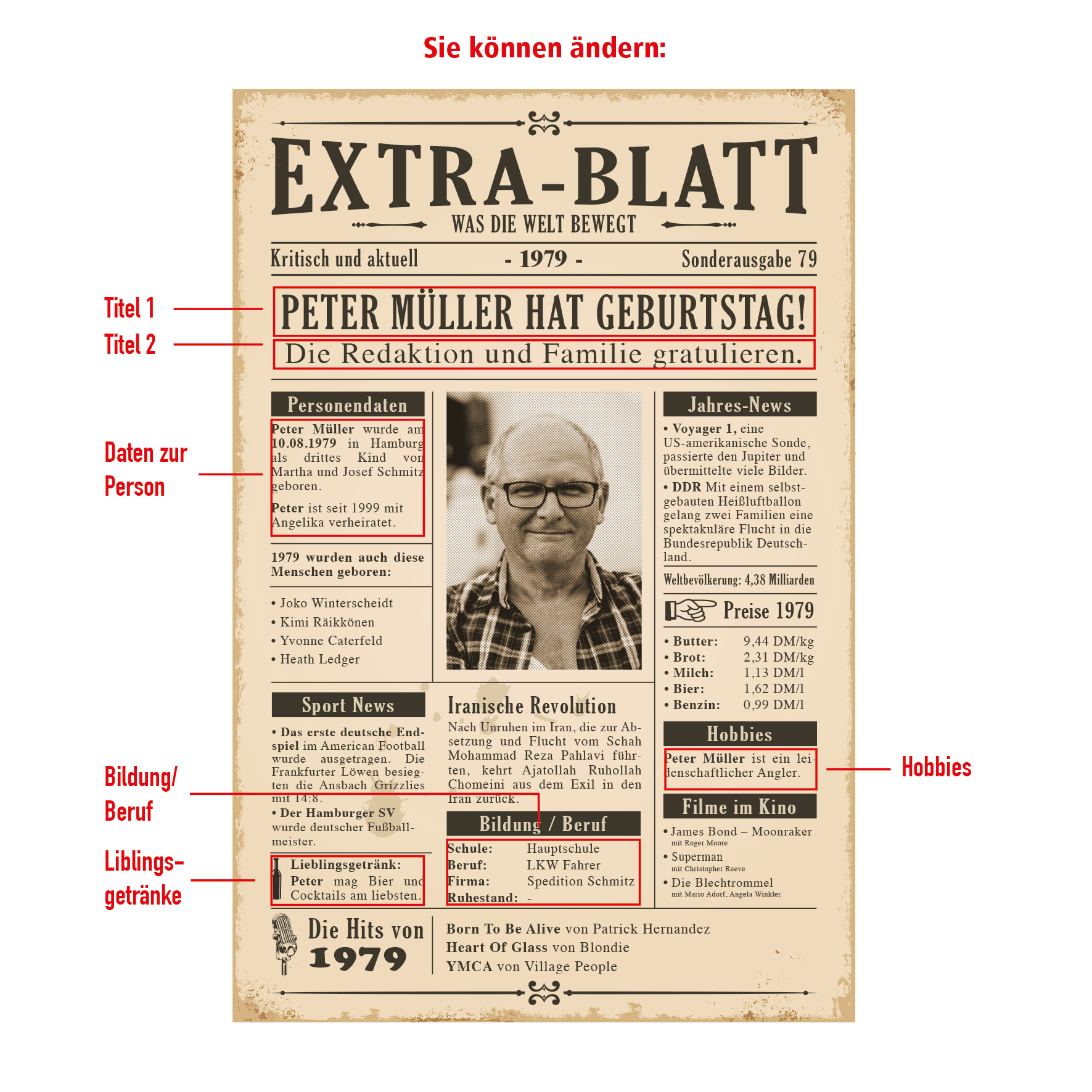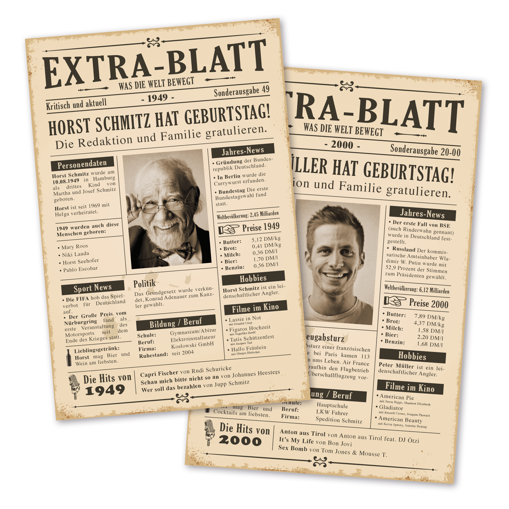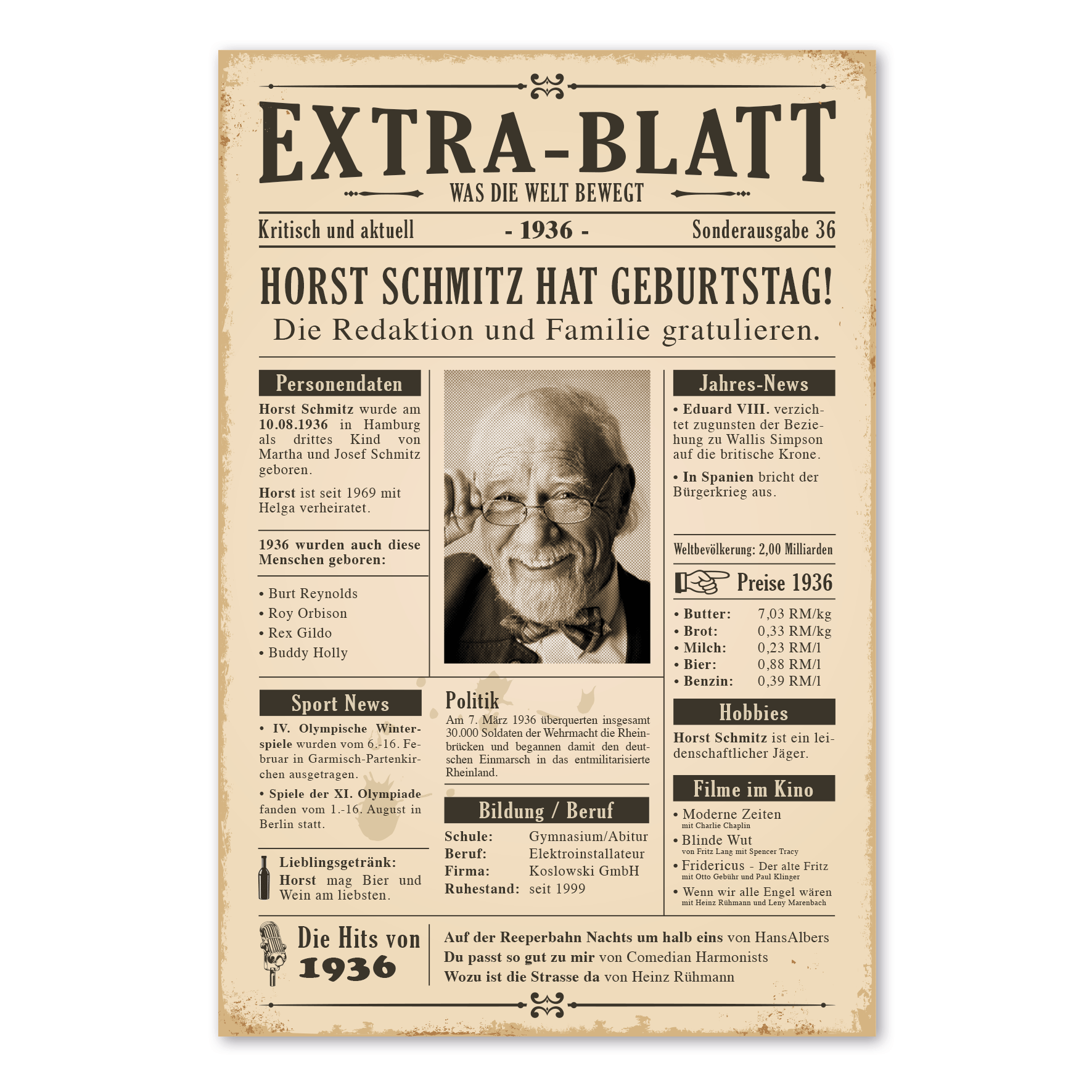 Geburtstagszeitung mit historischen Fakten, Ihrem Foto und persönlichen Daten als Schild