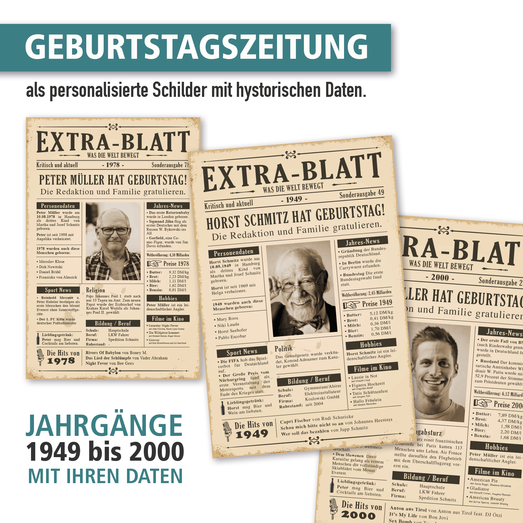 Unsere Geburtstagszeitung im Retro Look mit historischen Fakten zum jeweiligen Jahr, Ihrem Foto und persönlichen Daten ist das perfekte Geburtstagsgeschenk. Überraschen Sie das Geburtstagskind mit einem hochwertigen Schild im Stil eines Extrablatts aus vergangenen Zeiten. Unsere Geburtstagszeitung ist für die Jahre 1949 bis 2000 ausgelegt, die jeweiligen Fakten entsprechen in Kurzform den damaligen Jahresereignissen. Diese Fakten, kombiniert mit dem Foto und Personendaten des Geburtstagskindes, setzen wir zu einer informativen und bleibenden Erinnerung zusammen, die die beschenkte Person sicherlich begeistern wird. Unsere Geburtstagszeitungen als Schilder bestechen durch einen brillanten, kontrastreichen Druck und Langlebigkeit, sie sind massiv, da aus 3 mm Aluminium-Verbundmaterial, und daher ausgesprochen formstabil. Ihr Foto und Ihre Wunschdaten können Sie uns ganz bequem im Rahmen der Bestellung über die Upload-Funktion und die Texteingabefelder im Konfigurator auf dieser Seite zukommen lassen. Bitte beachten Sie weiter unten unsere Angaben zur Personalisierung dieser Schilder.