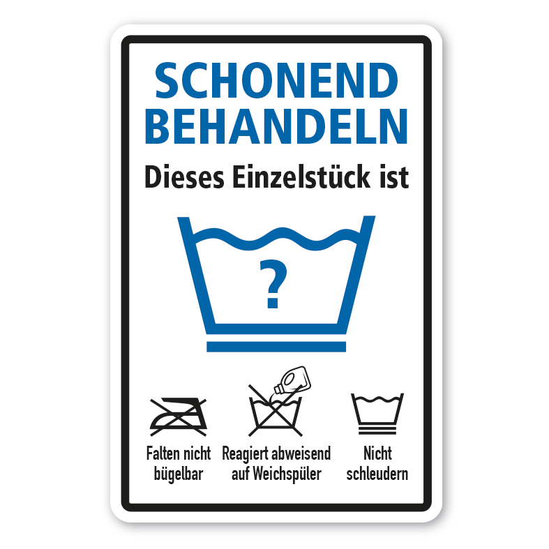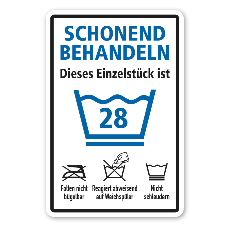 Originelles Geburtstagsschild im Waschanleitungsformat. Dieses Fun-Schild kommt auf Geburtstagspartys und beim Geburtstagskind immer gut an. Merkmale des lustigen Geburtstagsschildes Schonend behandeln - Dieses Einzelstück ist - mit Ihrer Zahl und Wunschtext - Variante 01 – FUN-T-71: Material: Aluminium 2 mm Ausführung: standard weiß. Alternative Ausführungen sind möglich. Abmessungen: 300 x 200 mm 450 x 300 mm 600 x 400 mm (bewährte Standardgröße – wird empfohlen) 750 x 500 mm 900 x 600 mm Verarbeitung: rechteckig beschnitten mit abgerundeten Ecken Verpackungseinheiten: 1 Fun-Schild Bitte beachten Sie: Dieses originelle Fun-Schild kann nur mit individuellen Attributen bestellt werden. Geben Sie Ihren Wunschtext in das Eingabefeld auf dieser Seite ein. Nach Ihrer Bestellung setzen wir Ihre Wünsche um und übermittelt Ihnen eine Korrekturdatei zur Ansicht. Bitte prüfen Sie die Inhalte dieser Korrektur auf Fehler und erteilen uns, sofern alles in Ordnung ist, unbedingt die Druckfreigabe. Ihr Schild kann erst dann produziert werden, wenn uns Ihre Druckfreigabe vorliegt. Schilder mit Text- und Zeichenänderungen oder nach Ihrer Vorgabe gelocht sind individuelle Schilder und somit grundsätzlich vom Rückgaberecht ausgeschlossen.