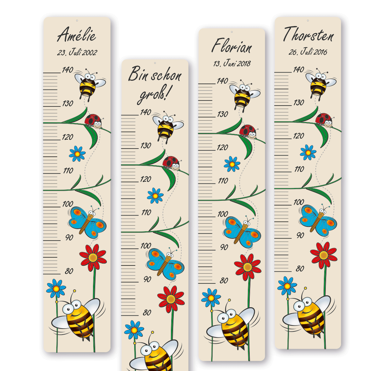 Messlatte für Kinder mit lustigen Insekten - Bin schon groß - auch mit Ihrem Wunschtext. Messbereich 80 - 140 cm - 1 Loch zur Befestigung