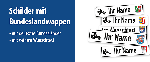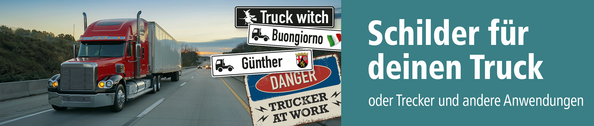 Sie sind beruflich mit einem LKW unterwegs? Dann sind vielleicht unsere Trucker-Schildern etwas für Sie, die wir in vielen Ausführungen anbieten – als Namensschild zur Platzierung hinter der Frontscheibe Ihres Fahrzeuges oder individueller Parkplatzreservierer, vielleicht mit einer Landesflagge, einem Bundeswappen oder einfach nur mit Ihrem Kennzeichen ausgestattet. Diese Schilder sind auch mit einem Traktorsymbol, als Hochzeitsschilder – Just married – oder Straßenschilder mit Ihrem individuellen Straßennamen erhältlich. Den Anwendungen und Inhalten unserer Fun-Schilder sind keine Grenzen gesetzt.