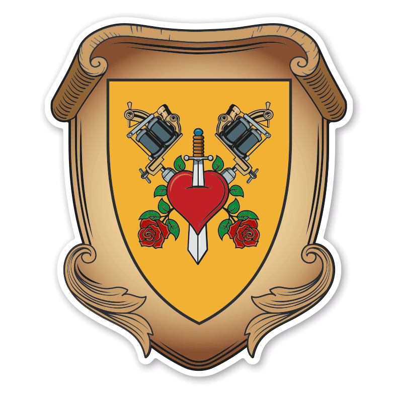 Maibaumschild / Zunftschild Tätowierer. Unsere Maibaumschilder und Zunftwappen sind in Ihrer Symbolik mittelalterlichen oder neueren Ausführungen der Zunftzeichen einzelner Handwerksgilden nachempfunden. Da die Handwerkswappen der einzelnen Berufsstände je nach Stadt, Land oder Zeitepoche stark variieren können, haben wir uns bei der grafischen Umsetzung auf allgemein gebräuchliche Abbildungen der Werkzeuge und Werkzeugzusammenstellungen konzentriert. Weiterhin wurden einzelne Zunftzeichen um neuere Symbole oder Werkzeuge ergänzt, um auch neuzeitlichen Berufen gerecht zu werden. Unsere Maibaumschilder zur Brauchtumspflege aus deutscher Fertigung sind langlebig, außerordentlich stabil und somit wahre Schmückstücke für jeden Maibaum.