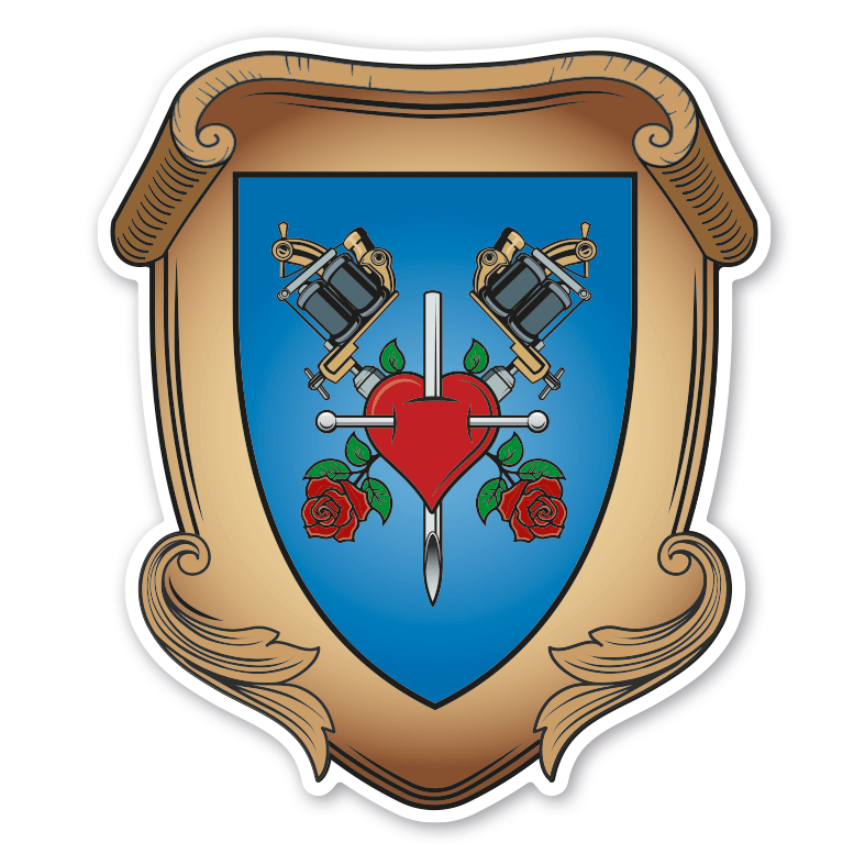 Maibaumschild / Zunftschild Tätowierer - Piercer. Unsere Maibaumschilder und Zunftwappen sind in Ihrer Symbolik mittelalterlichen oder neueren Ausführungen der Zunftzeichen einzelner Handwerksgilden nachempfunden. Da die Handwerkswappen der einzelnen Berufsstände je nach Stadt, Land oder Zeitepoche stark variieren können, haben wir uns bei der grafischen Umsetzung auf allgemein gebräuchliche Abbildungen der Werkzeuge und Werkzeugzusammenstellungen konzentriert. Weiterhin wurden einzelne Zunftzeichen um neuere Symbole oder Werkzeuge ergänzt, um auch neuzeitlichen Berufen gerecht zu werden. Unsere Maibaumschilder zur Brauchtumspflege aus deutscher Fertigung sind langlebig, außerordentlich stabil und somit wahre Schmückstücke für jeden Maibaum.