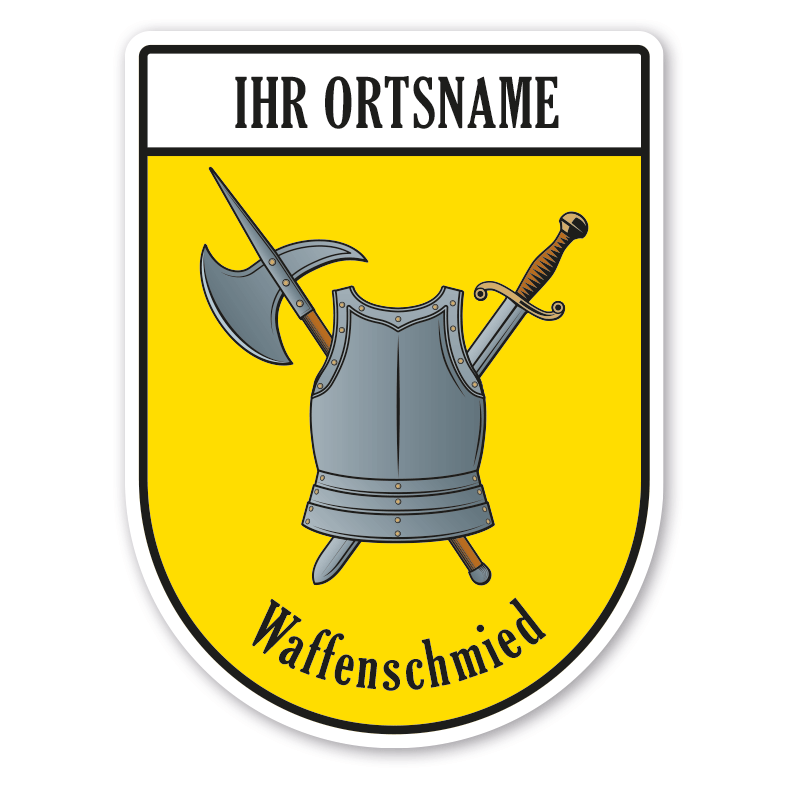 Maibaumschild Waffenschmied - Schmied mit Zunftnamen, Ortsnamen oder Ihrem Wunschtext. Unsere Maibaumschilder und Zunftwappen sind in Ihrer Symbolik mittelalterlichen oder neueren Ausführungen der Zunftzeichen einzelner Handwerksgilden nachempfunden. Da die Handwerkswappen der einzelnen Berufsstände je nach Stadt, Land oder Zeitepoche stark variieren können, haben wir uns bei der grafischen Umsetzung auf allgemein gebräuchliche Abbildungen der Werkzeuge und Werkzeugzusammenstellungen konzentriert. Weiterhin wurden einzelne Zunftzeichen um neuere Symbole oder Werkzeuge ergänzt, um auch neuzeitlichen Berufen gerecht zu werden. Unsere Maibaumschilder zur Brauchtumspflege aus deutscher Fertigung sind langlebig, außerordentlich stabil und somit wahre Schmückstücke für jeden Maibaum.