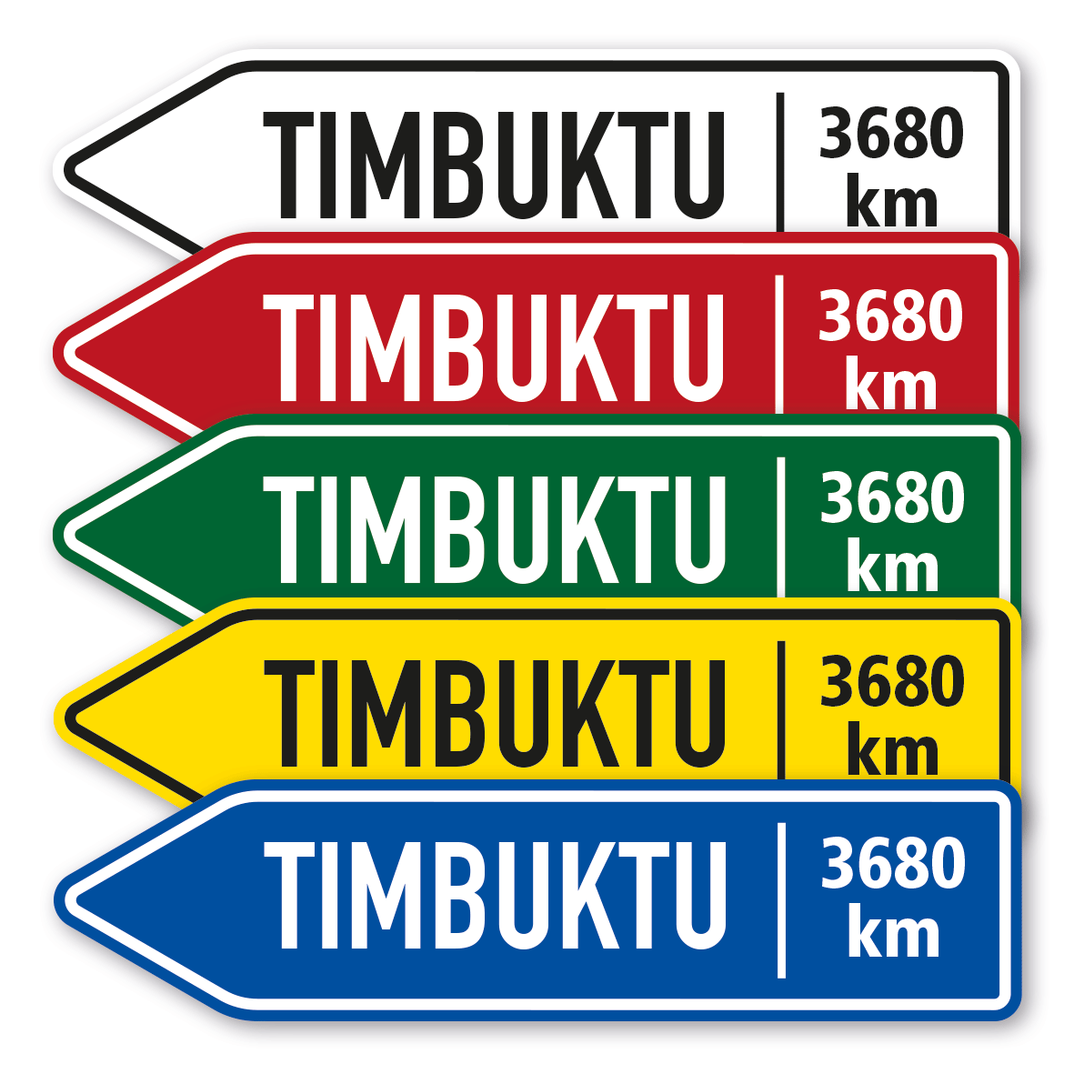 Welt-Wegweiser in verschiedenen Farben und Formen sind beliebt, wie man mittlerweile vielerorts an den aufgestellten "Schilderbäumen" beobachten kann, an die zahlreiche, in jede Himmelsrichtung weisende Pfeilschilder angebracht wurden. Die Angaben auf diesen Pfeilwegweisern beinhalten zumeist Städte- und Ländernamen mit den jeweiligen Entfernungsangaben in Kilometern oder Meilen, es werden aber auch lokale Ziele angezeigt mit Meter- oder Schrittangaben. Wir führen diverse Welt-Wegweiser in verschiedenen Farbvarianten und Formen, die Sie mit Ihren individuellen Inhalten füllen können. Erstellen Sie Ihren eigenen "Schilderbaum" mit Angaben zu Ihren Lieblingsorten, mit Wegweisern zu örtlichen Geschäften oder touristischen Zielen und kombinieren Sie diese mit Entfernungsangaben in vielfältiger Form. Unsere Pfeilschilder werden aus 2 mm Hartaluminium gefertigt, im hochwertigen Digitaldruck bedruckt und anschließend mit einem UV-Schutzlack überzogen, sie sind wetterfest und extrem langlebig.