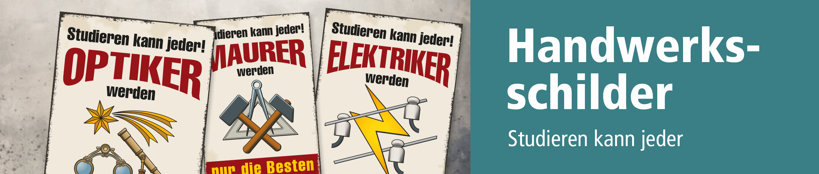 Diese Schilder sind der Klassiker unter den Werkstattschildern – der Slogan "Studieren kann jeder" ist das ultimative Statement für den Handwerkerstolz. Er dreht das gesellschaftliche Klischee, dass das Studium das höchste Ziel sei, einfach um und rückt das handwerkliche Können ins Rampenlicht. Dennoch führen wir auch Schilder für diverse akademische Berufe, mit der Bedeutung, dass eben nicht alle ein bestimmtes Studium absolvieren können.