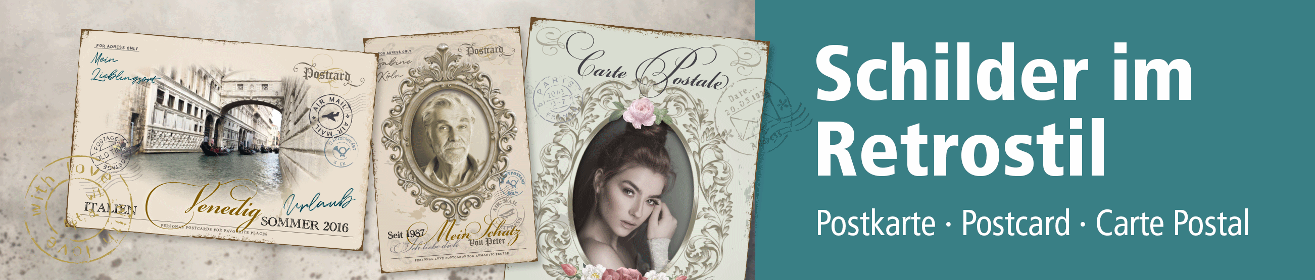 In dieser Schilderkategorie führen wir für Sie zahlreiche Retroschilder in nostalgischen Postkartenausführungen. Unsere liebevoll gestalteten Postkarten, Postcards oder Cartes postales als Schilder sind alten Postkarten nachempfunden in verschiedenen Ausführungen, Sprachen und mit diversen Poststempeln zur Unterstreichung der alten Postkartenstile ausgerüstet. Erhältlich sind verschiedene Motive in nachempfundener Machart der damaligen Zeit – z. B. Postcards mit Musikinstrumenten und Blumenmotiven – es wurden aber auch neuzeitliche Themen aufgegriffen und die zur Verwendung gekommenen Bilder grafisch so angepasst, dass sie wie gemalt wirken. Je nach Ausführung der Postkarten sind die Motivschilder zur Unterstreichung des jeweiligen Themas mit passenden Gedichten oder Zitaten historischer Personen hinterlegt, so z. B. von Johann Wolfgang von Goethe. Es kommen aber auch anderen Text- und Grafikelemente zum Einsatz, um die jeweilige Postkartenaussage zu unterstreichen. Des Weiteren führen wir auch Postcard Schilder mit der Möglichkeit, Ihr persönliches Foto einzubinden, und wie die meisten unserer Schilder, sind auch unsere Postcards mit Ihren Wunschtexten erhältlich. Postkartenschilder mit Ihrem Bild und Wunschtexten sind persönlich und originell, sie sind ausgesprochen dekorativ und eine schöne Geschenkidee für jeden Anlass.