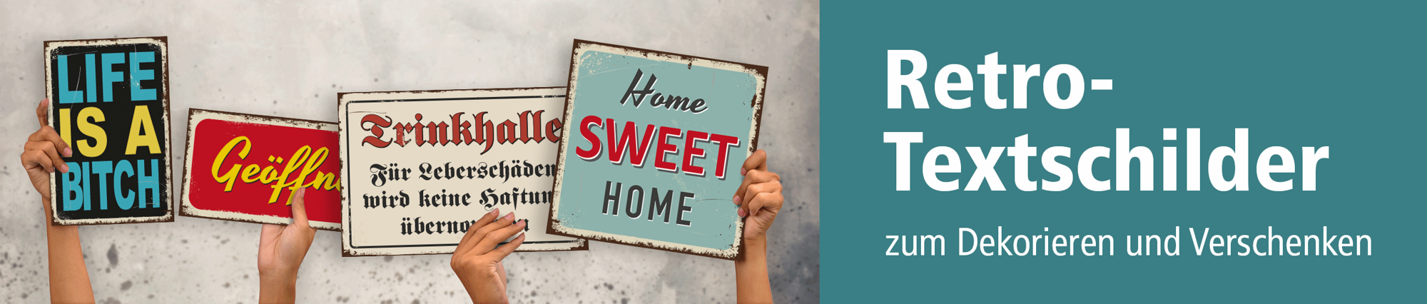 In dieser Kategorie finden Sie überwiegend reine Textschilder ohne Symbole und andere Grafiken – z. B. Spruchschilder mit zahlreichen Aussagen. Unsere Retro-Textschilder sind in diversen Größen und Ausführungen erhältlich – als Standardartikel oder in individuellen Ausführungen mit Ihrem Wunschtext, sofern dies für den jeweiligen Artikel vorgesehen wurde. Textänderungen lassen sich direkt über die Artikelseiten vornehmen – einfach im zuständigen Eingabefeld eingeben und bestellen. Wir schicken Ihnen nach Ihrer Bestellung eine Korrektur zur Ansicht, die Sie freigeben müssen. Sollten Sie bestimmte Schilder im alten Style in unserem Online-Shop vermissen, bitten wir um Nachricht. Anregungen zur Erweiterung unseres Fun-Schildersortiments sind uns stets willkommen.