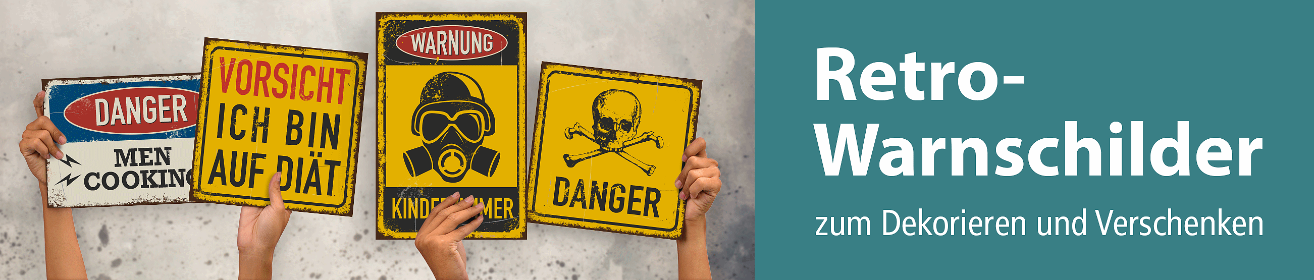 Unsere Retro-Warnschilder sind in diversen Größen und Ausführungen erhältlich – als Standardartikel oder in individuellen Ausführungen mit Ihrem Wunschtext, sofern dies für den jeweiligen Artikel vorgesehen wurde. Textänderungen lassen sich direkt über die Artikelseiten vornehmen – einfach im zuständigen Eingabefeld eingeben und bestellen. Wir schicken Ihnen nach Ihrer Bestellung eine Korrektur zur Ansicht, die Sie freigeben müssen. Sollten Sie bestimmte Warnschilder im alten Style in unserem Online-Shop vermissen, bitten wir um Nachricht. Anregungen zur Erweiterung unseres Fun-Schildersortiments sind uns stets willkommen.