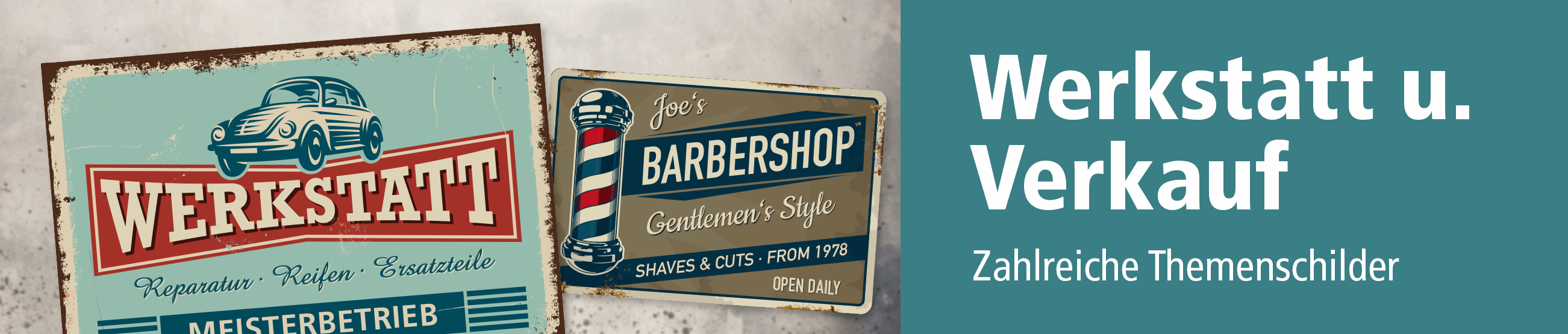 In dieser Kategorie führen wir zahlreiche Schilder im Retro-Look für Ihre Werkstatt oder Unternehmen, darunter originelle Firmenschilder und Verkaufsschilder. Unsere Retroschilder sind in diversen Größen und Ausführungen erhältlich – als Standardartikel oder in individuellen Ausführungen mit Ihrem Wunschtext, sofern dies für den jeweiligen Artikel vorgesehen wurde. Textänderungen lassen sich direkt über die Artikelseiten vornehmen – einfach im zuständigen Eingabefeld eingeben und bestellen. Wir schicken Ihnen nach Ihrer Bestellung eine Korrektur zur Ansicht, die Sie freigeben müssen. Sollten Sie bestimmte Schilder im alten Look in unserem Online-Shop vermissen, bitten wir um Nachricht. Anregungen zur Erweiterung unseres Schildersortiments sind uns stets willkommen.