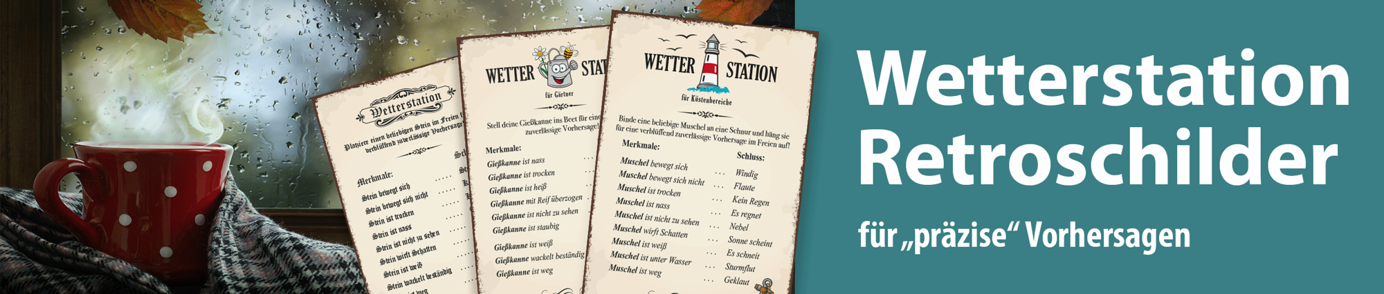 Vergessen Sie handelsübliche Wetterstationen mit elektronischem Schnickschnack. Es geht auch deutlich günstiger mit unseren lustigen Wetterstationsschildern. In dieser Kategorie finden Sie zahlreiche Themenschilder in liebevoller Ausführung, die mit einfachen Hilfsmitteln "zuverlässig" funktionieren, und die jeder versteht. Unsere Wetterstationen im Schilderformat werden im hochwertigen Digitaldruck mit anschließender UV-Schutzlackierung aus 2 mm Hartaluminium in diversen Größen als Standardartikel oder in individuellen Ausführungen mit Ihrem Wunschtext, wenn Sie dies wünschen und in den Artikeln auch vorgesehen wurde. Sollten Sie bestimmte Wetterstationen in unserem Online-Shop vermissen, bitten wir um Nachricht. Anregungen zur Erweiterung unseres Schildersortiments sind uns stets willkommen.