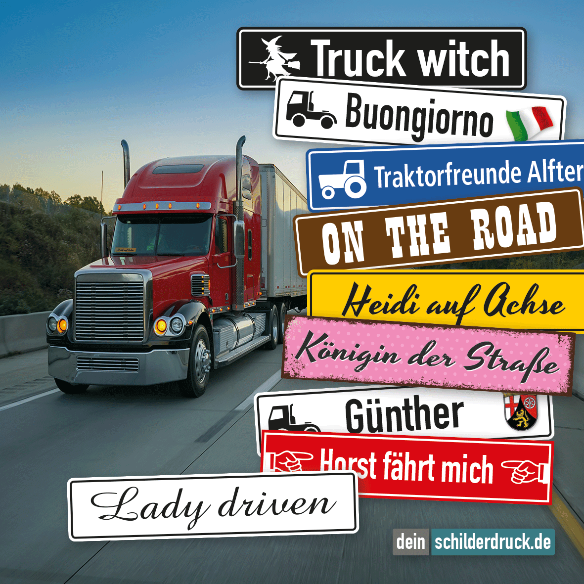 Originelles Truck / LKW - Schild in 9 Farben mit Wunschtext – Schrift Standard. Fun-Schilder oder Namensschilder für Trucker verleihen dem Führerhaus eine persönliche Note, sind aber auch für jeden anderen Beschilderungszweck geeignet. Fun-Schilder sind Schilder der etwas anderen Art. Sie sind humorvoll, manchmal ein wenig derb, heben sich aber von herkömmlichen Schildern deutlich ab. Fun-Schilder oder Dekoschilder sind originelle Geschenke und aufgrund der Möglichkeit der Individuallisierung sehr persönlich. Merkmale des Fun - Schildes / Truck / LKW-Schildes in 9 Farben mit Wunschtext – Schrift Standard– LKW-IND-01: Material: Aluminium 2 mm Ausführung: Ihre Wahl der Farbvariante. Abmessungen: 500 x 110 mm (Standardgröße) Verarbeitung: rechteckig beschnitten mit abgerundeten Ecken Verpackungseinheiten: 1 Fun-Schild Bitte beachten Sie: Dieses originelle Fun-Schild kann mit individuellen Attributen bestellt werden. Geben Sie Ihren Wunschtext in das Eingabefeld auf dieser Seite ein und bestimmen Sie, in welcher Farbvariante Ihr Schild produziert werden soll. Nach Ihrer Bestellung setzen wir Ihre Wünsche um und übermittelt Ihnen eine Korrekturdatei zur Ansicht. Bitte prüfen Sie die Inhalte dieser Korrektur auf Fehler und erteilen uns, sofern alles in Ordnung ist, unbedingt die Druckfreigabe. Ihr Schild kann erst dann produziert werden, wenn uns Ihre Druckfreigabe vorliegt. Diese Schrift ist für Groß- und Kleinschreibung oder nur Großschreibung geeignet. Schilder mit Text- und Zeichenänderungen oder nach Ihrer Vorgabe gelocht sind individuelle Schilder und somit grundsätzlich vom Rückgaberecht ausgeschlossen. Für eine bessere Sichtbarkeit im Dunkeln wird die reflektierende Schildervariante empfohlen – angestrahlt von Autoscheinwerfern leuchtet das Schild hell in der Dunkelheit. Wünschen Sie andere Schilder – z.B. aus dem Bereich der Sicherheitskennzeichnung oder Betriebsschilder mit Symbolen? Informieren Sie sich in den jeweiligen Kategorien oder in unserem Download-Bereich.