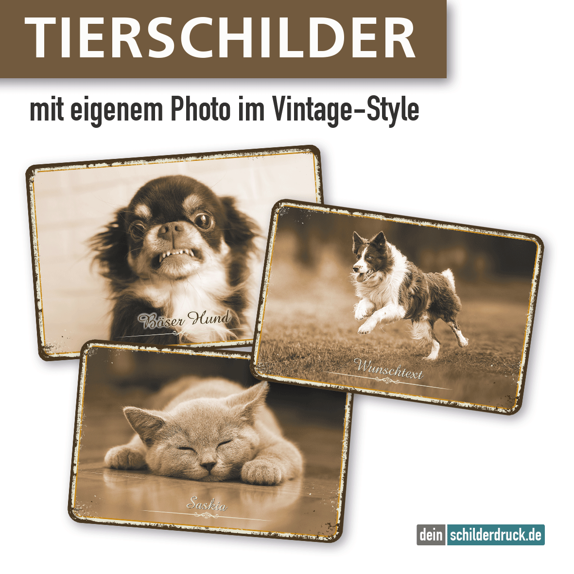 Personalisiertes Hundeschild / Tierschild für Ihr Zuhause, die Haustür oder das Gartentor. Unsere Hunde-Photo-Schilder sind für Ihre Bilder konzipiert, die Sie uns bequem im Rahmen der Bestellung über die Upload-Funktion zukommen lassen können. Ihr Bild wird in das vorgefertigte Layout eingefügt, der Text entsprechend Ihrer Angaben abgesetzt. Die Produktion erfolgt nach Ihrer Druckfreigabe im hochwertigen Digitaldruck mit anschließender UV/Antigraffiti-Schutzlackierung. Unsere ansprechenden Photoschilder werden aus 2 mm Hartaluminium gefertigt und sind daher außerordentlich stabil und langlebig. Dieses Schild ist keinesfall nur für die Verwendung von Ihren Hundephotos geeignet. Sie können auch Photos in Form von anderen Tierbildern, Familienbildern und Bildern jeder anderen Thematik platzieren lassen. Es sind Ihnen in dieser Hinsicht keine Grenzen gesetzt. Merkmale dieses ansprechenden Hunde-Photo-Schildes in fünf Farbvarianten Die Vorteile im Überblick: individuelle Fertigung mit Ihrem Photo und Wunschtext in drei Größen und 5 Farbvarianten erhältlich (Sondergrößen sind möglich) brillante Bildqualität Fertigung aus 2 mm Hartaluminium wetterfest, lichtbeständig und rostfrei UV/Antigraffiti-Schutzlackierung für mehr Schutz und eine noch längere Lebensdauer auf Wunsch auch gelocht zur Befestigung erhältlich Ausführung: Querformat Material: Aluminium 2 mm Abmessungen: 200 x 150 mm 300 x 200 mm 450 x 300 mm Verarbeitung: rechteckig beschnitten mit abgerundeten Ecken Verpackungseinheiten: 1 Schild Bitte beachten Sie: Dieses Hundeschild / Tierschild / Photoschild kann nur mit individuellen Attributen bestellt werden. Laden Sie Ihr Bild über den Konfigurator auf dieser Seite auf unseren Server. Stellen Sie zuvor unbedingt sicher, dass Ihr Wunschbild hoch aufgelöst ist bzw. in den Abmessungen mindestens der gewünschten Schildergröße entspricht. Ein Photo, das mit einem aktuellen Smartphone aufgenommen wurde, ist in der Regel gut geeignet. Nach Ihrer Bestellung setzen wir Ihre Wünsche um und übermittelt Ihnen eine Korrekturdatei zur Ansicht. Bitte prüfen Sie die Inhalte dieser Korrektur auf Fehler und erteilen uns, sofern alles in Ordnung ist, unbedingt die Druckfreigabe. Ihr Schild kann erst dann produziert werden, wenn uns Ihre Druckfreigabe vorliegt. Bei individuellen Artikeln gilt die angegebene Lieferzeit erst nach erfolgter Druckfreigabe. Schilder mit Text- und Zeichenänderungen oder nach Ihrer Vorgabe gelocht sind individuelle Schilder und somit grundsätzlich vom Rückgaberecht ausgeschlossen.