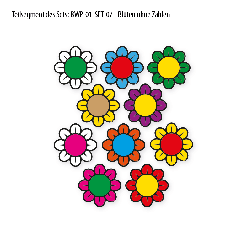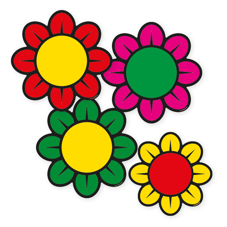 Ausreichende Bewegung trägt erheblich zu einer gesunden körperlichen und geistigen Entwicklung von Kindern bei. Leider verbringen Kinder mittlerweile viel Zeit mit Fernsehen, Online-Spielen und Spielkonsolen. Auch bestimmt der Computer schon vielfach den kindlichen Alltag – wichtige Bewegungszeit geht durch den Gebrauch dieser Medien verloren. Um diesen Defiziten entgegenzuwirken, ist es erforderlich, Kinder verstärkt zur Bewegung zu animieren – im Kreise der Familie, auf Spielplätzen, aber auch schon in Kindergärten und Grundschulen sollte auf eine Bewegungsförderung besonderer Wert gelegt werden. Bewegungspfade helfen bei dieser Aufgabe, sie regen Kinder an, sich spielerisch zu bewegen und unterstützen positiv ihre motorische Entwicklung. Unsere mehrteiligen Bewegungspfad-Sets für den Innenbereich sind in kindgerechten Ausführungen als Wand- oder Bodenkleber zur Selbstverklebung erhältlich, sie sind mit anderen Sets kombinierbar und können mit ebenfalls erhältlichen Einzelelementen einfach verlängert werden. So lassen sich auch umfangreiche, ineinander verwundene und sehr lange Bewegungspfade in großen Bereichen problemlos verwirklichen. Merkmale dieses Set-Artikels Farbige Blumen - BWP-01-SET-07:   Material:  Hochleistungs-Vynil-Folie, Stärke 0,1 mm, transparentes, rutschfestes (DIN 51130, Klasse R9) Polycarbonat-Schutzlaminat, Stärke 0,125 mm  Schwer entflammbar nach DIN EN 15501-1  Größe:   30 x 30 cm (Breite x Höhe) – je Blumenvariante 1 Stück / 10 Stück gesamt  Gesamtgröße: ca. 30 x 331 cm (Breite x Höhe) bei einer gradlinigen Verklebung und Segmentabständen von 35 cm (Segmentmitte zur Segmentmitte)  Verarbeitung: formgeschnitten  Verpackungseinheit: 10-teiliges Aufkleberset zur Selbstverklebung, 1 x Kaschierrakel, Informationen zur Verklebung im Karton  Einsatzbereiche: Innenanwendung – Flure und freie Bereiche in Kindergärten, Schulen und Freizeiteinrichtungen  Bitte beachten Sie: Unsere langlebigen Bodenkleber für Bewegungspfade sind für alle glatten Böden (gegossen oder fest mit dem Untergrund verbunden) im Innenbereich geeignet. Für eine optimale Haftung ist es erforderlich, dass die Untergründe frei von jeglichen Trennmitteln sind wie Staub, Schmutz, Fett und Wachs. Bitte reinigen Sie daher vor der Montage die Böden mit geeigneten Reinigungsmitteln.  Die Planung umfangreicher Bewegungspfade kann kompliziert sein, insbesondere ohne die Möglichkeit, alle Pfadmotive in ihrer Anordnung zu überblicken. Für diesen Fall stellen wir Ihnen unsere Planungs-PDF-Dateien zur Verfügung, in den unsere Bewegungspfad-Sets sowie einige Sondermotive im Maßstab 1:10 abgebildet sind. Sofern diese PDF-Daten 1:1 ausgedruckt werden und Sie einen geeigneten Untergrund (z.B. Zeichenkarton) mit dem Aufriss Ihrer Räumlichkeiten im gleichen Maßstab 1:10 angefertigt haben, können Sie die ausgedruckten Motive grob ausschneiden, auf Ihrem Untergrund beliebig hin und her schieben und für eine dauerhafte Planungsübersicht mit einem Klebestift fixieren. Diese analoge Vorgehensweise ist simpel und ermöglicht zugleich, auch mehreren Personen an der Planung mitzuwirken. Die Montage unserer Bewegungspfade ist einfach und kann auch von Ungeübten ohne Probleme sicher ausgeführt werden. Sollten Sie dennoch bei der Montage einen Bodenkleber falsch kleben oder beschädigen, bitten wir um Verständnis, dass wir keinen kostenlosen Ersatz leisten. Alle Einzelelemente eines Sets können auch als Einzelaufkleber erworben werden – zur Erweiterung Ihres Pfades oder als Ersatz bei Beschädigungen.  Weitere Informationen zum Set und zur Montage können Sie im PDF-Format weiter unten unter "Verfügbare Downloads" oder über unseren Download-Bereich unter "Bewegungspfade" aufrufen. Über unseren Download-Bereich können Sie auch unsere Planungs-PDF-Dateien aufrufen.