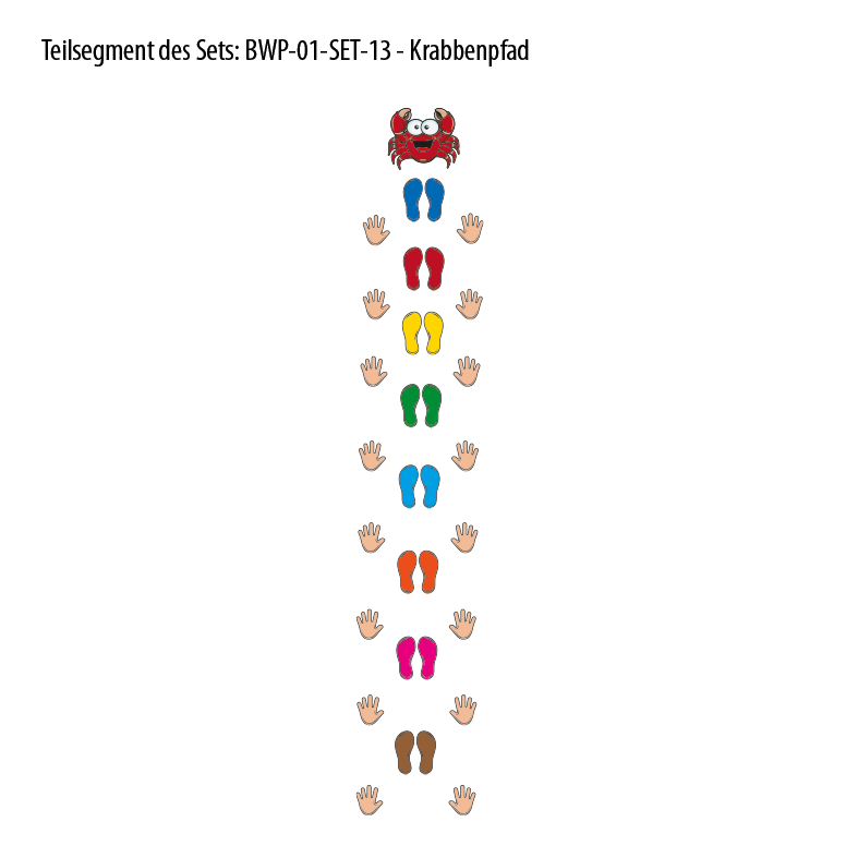 Ausreichende Bewegung trägt erheblich zu einer gesunden körperlichen und geistigen Entwicklung von Kindern bei. Leider verbringen Kinder mittlerweile viel Zeit mit Fernsehen, Online-Spielen und Spielkonsolen. Auch bestimmt der Computer schon vielfach den kindlichen Alltag – wichtige Bewegungszeit geht durch den Gebrauch dieser Medien verloren. Um diesen Defiziten entgegenzuwirken, ist es erforderlich, Kinder verstärkt zur Bewegung zu animieren – im Kreise der Familie, auf Spielplätzen, aber auch schon in Kindergärten und Grundschulen sollte auf eine Bewegungsförderung besonderer Wert gelegt werden. Bewegungspfade helfen bei dieser Aufgabe, sie regen Kinder an, sich spielerisch zu bewegen und unterstützen positiv ihre motorische Entwicklung. Unsere mehrteiligen Bewegungspfad-Sets für den Innenbereich sind in kindgerechten Ausführungen als Wand- oder Bodenkleber zur Selbstverklebung erhältlich, sie sind mit anderen Sets kombinierbar und können mit ebenfalls erhältlichen Einzelelementen einfach verlängert werden. So lassen sich auch umfangreiche, ineinander verwundene und sehr lange Bewegungspfade in großen Bereichen problemlos verwirklichen. Merkmale dieses Set-Artikels Krabbenpfad - Bewegungspfad-Set - BWP-01-SET-13: Material: Hochleistungs-Vynil-Folie, Stärke 0,1 mm, transparentes, rutschfestes (DIN 51130, Klasse R9) Polycarbonat-Schutzlaminat, Stärke 0,125 mm Schwer entflammbar nach DIN EN 15501-1 Größe: Füße/Fußabdrücke: ca. 11 x 24 cm (Breite x Höhe) - 8 Farben - je Farbe 1 Paar – gesamt 8 Paare/16 Segmente Hände/Handabdrücke : 15 x 17 cm (Breite x Höhe) - Paar (links/rechts) – gesamt 8 Paare/16 Segmente Krabbe: 40 x 15 cm (Breite x Höhe) – 1 Stück Gesamtgröße: ca. 71 x 394 cm (Breite x Höhe) bei einer gradlinigen Verklebung und Segmentabständen (Hände) von 40 cm (Segmentmitte zur Segmentmitte) wie unser Artikelbild Verarbeitung: formgeschnitten Verpackungseinheit: 33-teiliges Aufkleberset zur Selbstverklebung, 1 x Kaschierrakel, Informationen zur Verklebung im Karton Einsatzbereiche: Innenanwendung – Flure und freie Bereiche in Kindergärten, Schulen und Freizeiteinrichtungen Bitte beachten Sie: Unsere langlebigen Bodenkleber für Bewegungspfade sind für alle glatten Böden (gegossen oder fest mit dem Untergrund verbunden) im Innenbereich geeignet. Für eine optimale Haftung ist es erforderlich, dass die Untergründe frei von jeglichen Trennmitteln sind wie Staub, Schmutz, Fett und Wachs. Bitte reinigen Sie daher vor der Montage die Böden mit geeigneten Reinigungsmitteln. Die Planung umfangreicher Bewegungspfade kann kompliziert sein, insbesondere ohne die Möglichkeit, alle Pfadmotive in ihrer Anordnung zu überblicken. Für diesen Fall stellen wir Ihnen unsere Planungs-PDF-Dateien zur Verfügung, in den unsere Bewegungspfad-Sets sowie einige Sondermotive im Maßstab 1:10 abgebildet sind. Sofern diese PDF-Daten 1:1 ausgedruckt werden und Sie einen geeigneten Untergrund (z.B. Zeichenkarton) mit dem Aufriss Ihrer Räumlichkeiten im gleichen Maßstab 1:10 angefertigt haben, können Sie die ausgedruckten Motive grob ausschneiden, auf Ihrem Untergrund beliebig hin und her schieben und für eine dauerhafte Planungsübersicht mit einem Klebestift fixieren. Diese analoge Vorgehensweise ist simpel und ermöglicht zugleich, auch mehreren Personen an der Planung mitzuwirken. Die Montage unserer Bewegungspfade ist einfach und kann auch von Ungeübten ohne Probleme sicher ausgeführt werden. Sollten Sie dennoch bei der Montage einen Bodenkleber falsch kleben oder beschädigen, bitten wir um Verständnis, dass wir keinen kostenlosen Ersatz leisten. Alle Einzelelemente eines Sets können auch als Einzelaufkleber erworben werden – zur Erweiterung Ihres Pfades oder als Ersatz bei Beschädigungen. Weitere Informationen zum Set und zur Montage können Sie im PDF-Format weiter unten unter "Verfügbare Downloads" oder über unseren Download-Bereich unter "Bewegungspfade" aufrufen. Über unseren Download-Bereich können Sie auch unsere Planungs-PDF-Dateien aufrufen.