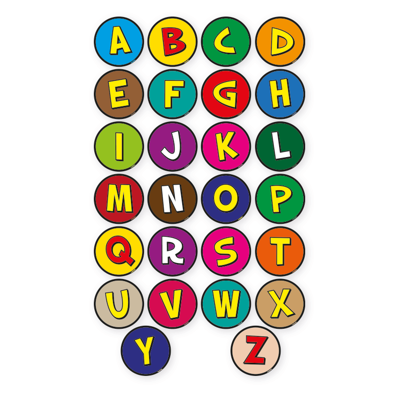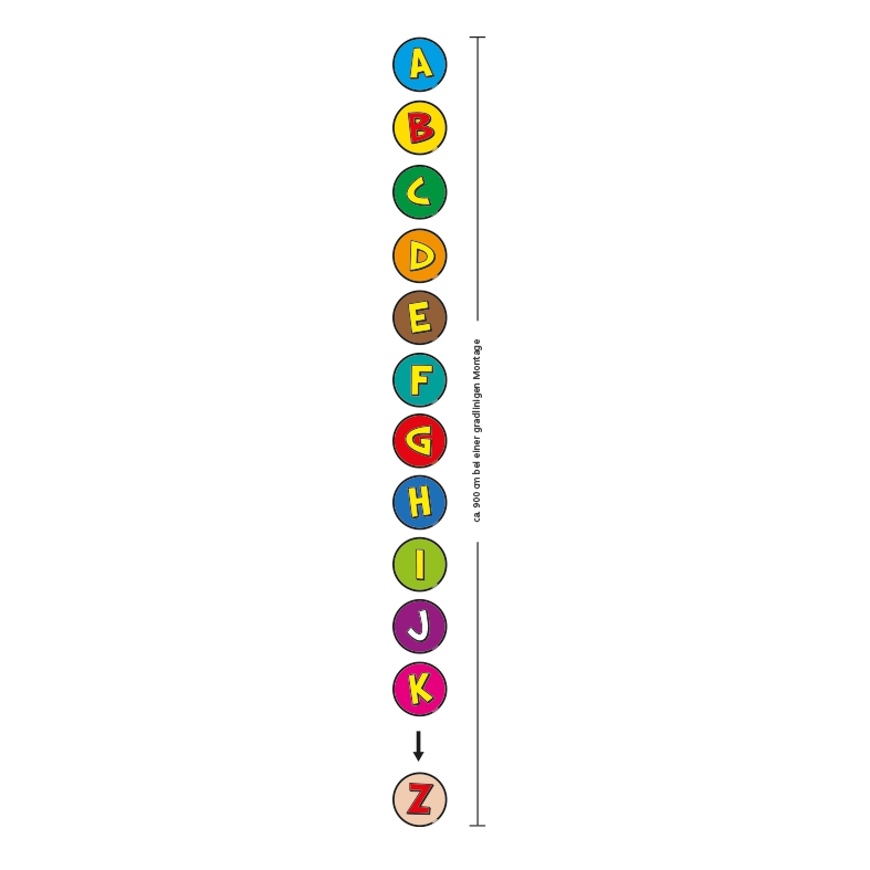 - Kreise: 30 x 30 cm (Breite x Höhe) mit Alphabet/Buchstaben A-Z in diversen Farben – je Buchstabe 1 Stück - gesamt 26 Stück