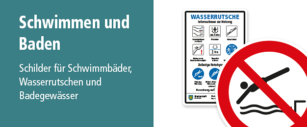 Schilder für Gewässer, Uferbereiche, Baggerseen und Flussläufe – Warnschilder, Verbote und Gebote. Kennzeichnung von Wasserrutschen.