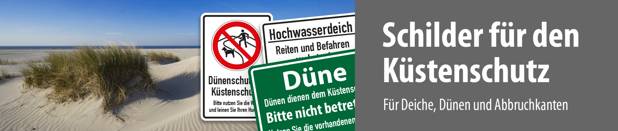 Wir führen in dieser Kategorie zahlreiche Schilder und Hinweise für Deiche, Dünen zu Gefahren an der Küste in vielen Ausführungen. Unsere Küstenschutzschilder sind in diversen Größen erhältlich, bei Bedarf auch mit Ihren Wunschtexten und anderen Symbolen wie auch in reflektierenden Varianten. Sollten Sie bestimmte Schilder zum Küstenschutz benötigen, die wir nicht in unserem Online-Shop führen, bitten wir um Nachricht. Wir fertigen Schilder auch nach Ihrer Vorgabe. Gerne unterbreiten wir Ihnen unser Angebot.