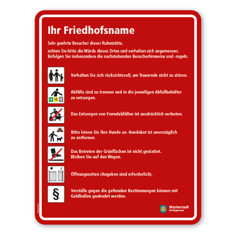 - Die Textinformationen neben den Piktogrammen auf unseren Friedhofsschildern stellen lediglich Standardinformationen bzw. die in unserer PDF-Übersicht oder auf den Friedhofsschilderdetailseiten aufgeführten Piktogrammbeschreibungen dar. Diese Beschreibungen fallen zum Teil minimalistisch aus und werden vielleicht in dieser Form Ihren Anforderungen nicht gerecht. Wir empfehlen daher, eigene, an Ihre Bedürfnisse angepassten Informationen zu den jeweiligen Piktogrammen auf Ihrem Friedhofsschild, sofern erforderlich, zu verwenden und uns diese im Rahmen der Schilderbestellung über das Texteingabefeld im Konfigurator zukommen zu lassen. Andere Texte wie Friedhofsnamen usw. lassen Sie uns bitte auf dem gleichen Wege zukommen.