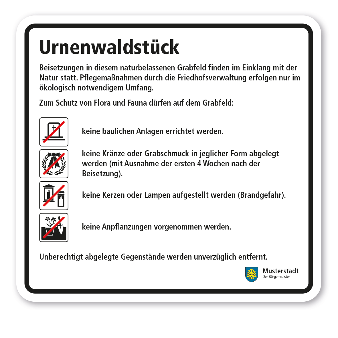Produktinformationen "Friedhofsschild Urnenwaldstück mit 4 Piktogrammen - 660 x 620 mm"