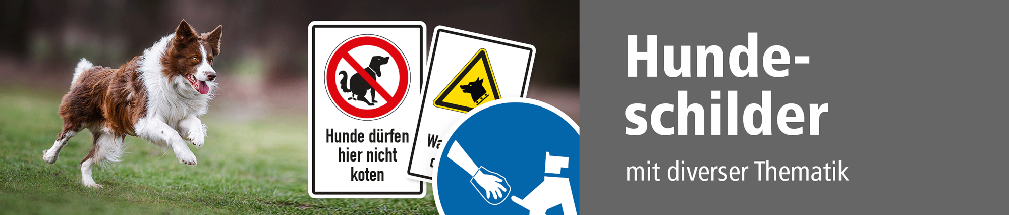 Hundeschilder sind in der Regel Hinweise für Hundehalter. Sie kennzeichnen Grünflächen und andere Bereiche, die für Hunde verboten oder freigegeben sind, dienen aber auch der Information – so z.B im Wald Hunde anzuleinen, um das Wild zu schützen bzw. nicht zu stören. Andere Hundeschilder weisen hingegen bestimmte Bereiche als Hundefreilaufzonen und Hundebadestellen aus, auf den keine Leinenpflicht vorgeschrieben ist und die Tiere ungestört herumlaufen können. Hundehalter werden an diesen Bereichen mit geeigneten Schildern aufgefordert, die Hinterlassenschaft Ihrer Tiere ordnungsgemäß zu entsorgen. Bei Hundeschildern kommen häufig genormte oder praxisbewährte Warnzeichen, Verbotszeichen oder Gebotszeichen in Einzelausführung oder in einer kombinierten Variante zum Einsatz, bestehend aus einem Sicherheitszeichen und passendem Textinhalt.