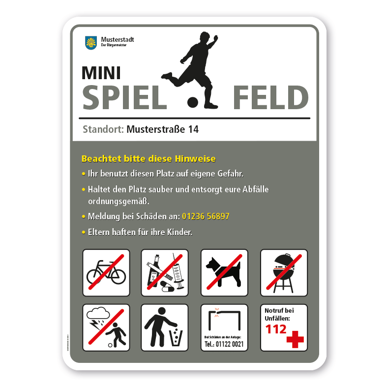 - Dieses Spielplatzschild kann nur mit individuellen Attributen bestellt werden, die über den Artikel-Konfigurator zusammengestellt werden. Es ist leider nicht möglich, auf der Artikelseite das konfigurierte Sportplatzschild darzustellen. Nach Ihrer Bestellung setzen wir Ihre Wünsche um und übermittelt Ihnen eine Korrekturdatei zur Ansicht. Bitte prüfen Sie die Inhalte dieser Korrektur auf Fehler und erteilen uns, sofern alles in Ordnung ist, unbedingt die Druckfreigabe. Ihr Sportplatzschild kann erst dann produziert werden, wenn uns Ihre Druckfreigabe vorliegt.