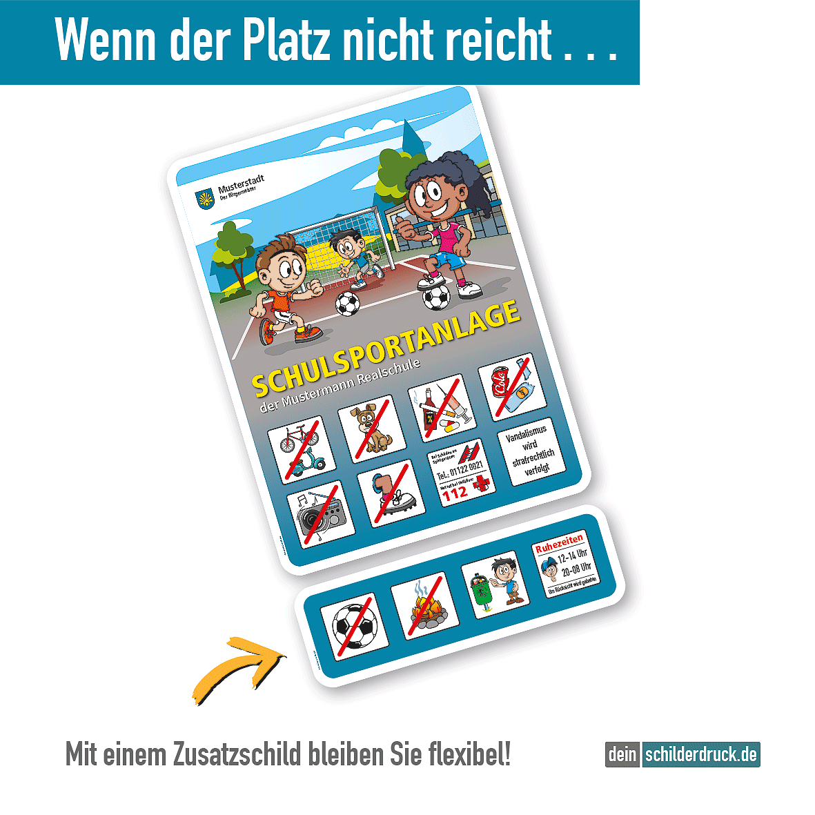 Dieses Spielplatz-Zusatzschild mit frei zu wählenden Piktogrammen ist ein Eränzungsschild zu unseren Spielplatz-, Bolzplatz- und Schulhofschildern aus der Spielplatz-Schilderserie SP-01, deren zahlreiche Themenschilder mit kindgerechten, unverwechselbaren Grafiken, die auch von kleinen Kindern verstanden werden, sowie vielfältigen Individualisierungsmöglichkeiten überzeugen. Wenn Sie eines unserer Spielplatzschilder in Verwendung haben und Zusatzinformationen erforderlich sind, sind unsere Zusatzschilder die beste Wahl. So können Sie sich aus zahlreichen Piktogrammen ein auf Ihre Bedüfnisse zugeschnittenes Zusatzschild zusammenstellen und auch alle Textinformationen in den Piktogrammen anpassen lassen. Das Zusatzschild kann direkt unter Ihrem bestehenden Spielplatzschild montiert werden. Es ist farblich auf die Spielplatzschilder aus der Schilderserie SP-01 angepasst und gewährleistet so eine einheitlich aussehende Beschilderung. Dieses Zusatzschild ist auch mit 4 Piktogrammen erhältlich.