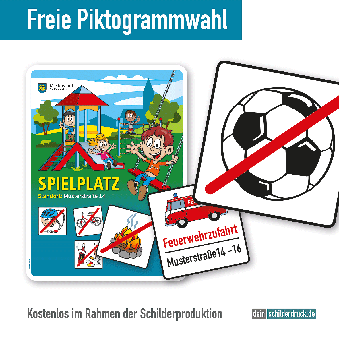 - Benötigen Sie unsere Spielplatzschilder in größeren Mengen, mit wechselnden Standortangaben und Piktogrammen in Kombination weiterer Themenschilder, z.B. für Bolzplätze, und andere Spiel- und Sportstätten, bitten wir um Ihre Anfrage. Gerne unterbreiten wir Ihnen ein Angebot mit angepassten Konditionen.