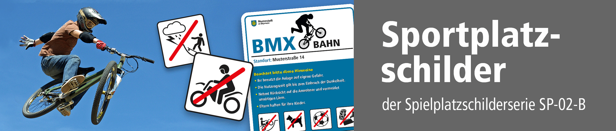 Dieses Sportplatzschild in 4 Farbvarianten mit frei zu wählenden Piktogrammen ist ein Schild aus unserer Spielplatz-Schilderserie SP-02-B, deren zahlreiche Themenschilder mit zeitgemäßen, unverwechselbaren Grafiken, die auch von kleinen Kindern verstanden werden, sowie vielfältigen Individualisierungsmöglichkeiten überzeugen. So können Sie sich aus zahlreichen Piktogrammen ein auf Ihre Bedüfnisse zugeschnittenes Spielplatzschild zusammenstellen, den Schildertitel und andere Textinformationen kostenlos ändern wie auch alle Textinformationen in den Piktogrammen anpassen lassen. In Verbindung mit unseren sicherheitsrelevanten Piktogrammen und Informationen zur Spielsicherheit sowie Kontaktdaten für den Notfall entsprechen alle Spiel-, Sport- und Schulhofschilder der Schilderserie SP-02 der europäischen Norm DIN EN 1176:2008-08. Merkmale des Spielplatzschildes - BMX-Bahn mit 8 frei zu wählenden Piktogrammen – Schilderserie SP-02-B: Norm: entspricht in Verbindung mit unseren sicherheitsrelevanten Piktogrammen bzw. den erforderlich Informationen der europäischen Norm DIN EN 1176:2008-08 Besonderheit: Dieses Schild ist in 4 Farbvarianten erhältlich. Wählen Sie kostenlos Ihre Variante. Anzahl der Piktogramme: 8 Piktogramme oder weniger Größe: 620 x 830 mm Material: Hartaluminium 2 mm Druck: mehrfarbig mit einer UV/Antigraffiti-Schutzlackierung Ausführung: gemäß Ihrer Konfiguration bzw. Angaben Verarbeitung: rechteckig beschnitten mit runden Ecken Verpackungseinheiten: ab einem Handball-Anlage-Schild Bitte beachten Sie: Dieses Sportplatzschild kann nur mit individuellen Attributen bestellt werden, die über den Artikel-Konfigurator zusammengestellt werden. Es ist leider nicht möglich, auf der Artikelseite das konfigurierte Sportplatzschild darzustellen. Nach Ihrer Bestellung setzen wir Ihre Wünsche um und übermittelt Ihnen eine Korrekturdatei zur Ansicht. Bitte prüfen Sie die Inhalte dieser Korrektur auf Fehler und erteilen uns, sofern alles in Ordnung ist, unbedingt die Druckfreigabe. Ihr Sportplatzschild kann erst dann produziert werden, wenn uns Ihre Druckfreigabe vorliegt. Die gewählten Piktogramme werden im Rahmen der Schilderproduktion direkt aufgedruckt, nicht als Aufkleber aufgebracht. Eine nach dem Druck aufgebrachte Lackierung schützt Ihr Schild samt Piktogrammen vor Verschmutzung und Witterungseinflüssen und erhöht die Lebensdauer. Belegen Sie weniger Piktogrammplätze als Ihnen zur Verfügung stehen, wird erst die oberste Piktogrammreihe von links nach rechts befüllt, dann die untere nach dem gleichen Prinzip. Es bleiben immer die letzten Piktogrammplätze in der untersten Reihe frei, sofern nichts anderes angegeben wurde. Benötigen Sie unsere Spielplatzschilder bzw. Sportplatzschilder in größeren Mengen, mit wechselnden Standortangaben und Piktogrammen in Kombination weiterer Themenschilder, z.B. für Spielplätze, und andere Spiel- und Sportstätten, bitten wir um Ihre Anfrage. Gerne unterbreiten wir Ihnen ein Angebot mit angepassten Konditionen. Bitte beachten Sie, dass konfigurierte Spielplatzschilder und Sportplatzschilder individuelle Artikel sind. Ein Rückgaberecht ist ausdrücklich ausgeschlossen. Die Piktogramme der Schilderserie SP-02 und SP-02-B sind identisch. Für beide Schilderserien gilt die Piktogramm-Gesamtübersicht SP-02. Weitere Informationen zu unseren Piktogrammen, zu ihrer Verwendung sowie eine Übersicht aller momentan verfügbaren Piktogramme finden Sie in unserem Download-Bereich oder HIER.
