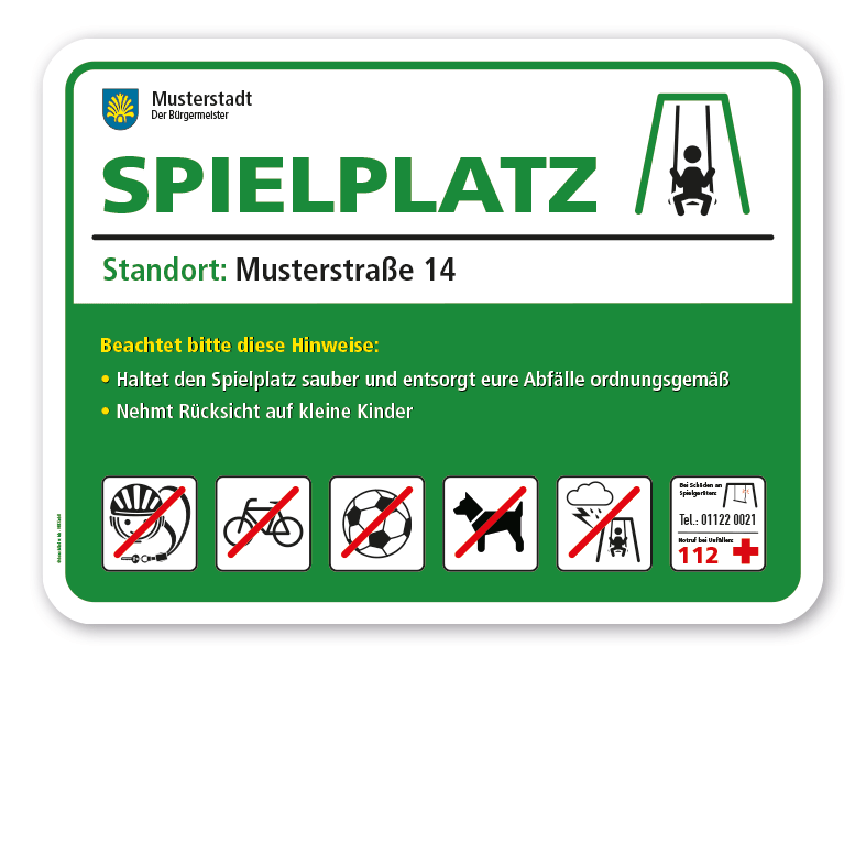 • Bitte beachten Sie, dass konfigurierte Spielplatzschilder und Sportplatzschilder individuelle Artikel sind. Ein Rückgaberecht ist ausdrücklich ausgeschlossen.