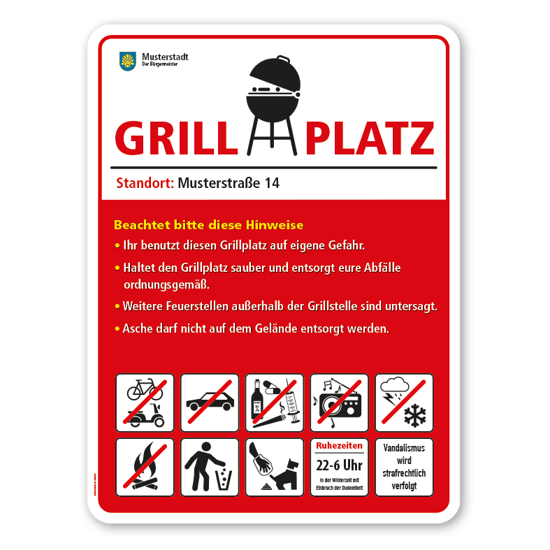 Dieses Grillplatzschild in 4 Farbvarianten mit frei zu wählenden Piktogrammen ist ein Schild aus unserer Spielplatz-Schilderserie SP-02-B, deren zahlreiche Themenschilder mit zeitgemäßen, unverwechselbaren Grafiken, die auch von kleinen Kindern verstanden werden, sowie vielfältigen Individualisierungsmöglichkeiten überzeugen. So können Sie sich aus zahlreichen Piktogrammen ein auf Ihre Bedüfnisse zugeschnittenes Schild zusammenstellen, den Schildertitel und andere Textinformationen kostenlos ändern wie auch alle Textinformationen in den Piktogrammen anpassen lassen. In Verbindung mit unseren sicherheitsrelevanten Piktogrammen und Informationen zur Sicherheit sowie Kontaktdaten für den Notfall entsprechen alle Spiel-, Sport- und Schulhofschilder der Schilderserie SP-02 der europäischen Norm DIN EN 1176:2008-08.