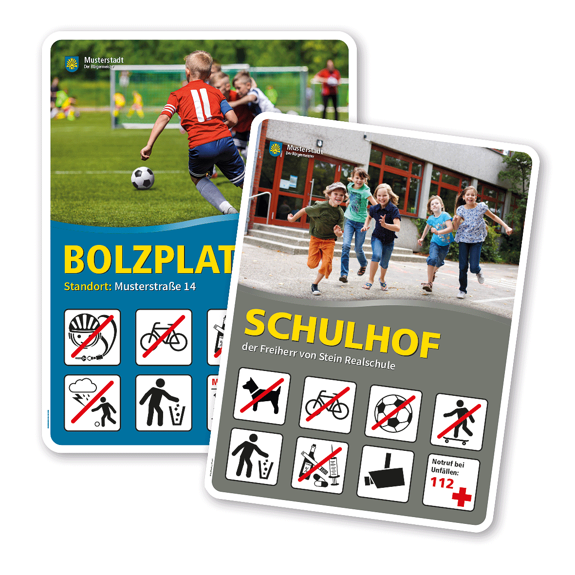 Norm: Sicherheitsrelevante Piktogramme entsprechen in Verbindung mit unseren Spielplatzschildern der europäischen Norm DIN EN 1176:2008-08