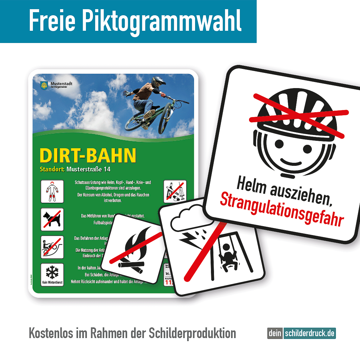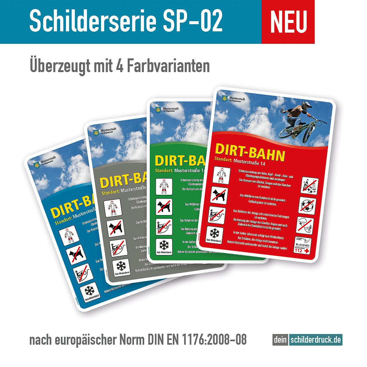 Dieses Sportplatzschild in 4 Farbvarianten mit frei zu wählenden Piktogrammen ist ein Schild aus unserer Spielplatz-Schilderserie SP-02, deren zahlreiche Themenschilder mit zeitgemäßen, unverwechselbaren Grafiken, die auch von kleinen Kindern verstanden werden, sowie vielfältigen Individualisierungsmöglichkeiten überzeugen. So können Sie sich aus zahlreichen Piktogrammen ein auf Ihre Bedüfnisse zugeschnittenes Spielplatzschild zusammenstellen, den Schildertitel und andere Textinformationen kostenlos ändern wie auch alle Textinformationen in den Piktogrammen anpassen lassen. In Verbindung mit unseren sicherheitsrelevanten Piktogrammen und Informationen zur Spielsicherheit sowie Kontaktdaten für den Notfall entsprechen alle Spiel-, Sport- und Schulhofschilder der Schilderserie SP-02 der europäischen Norm DIN EN 1176:2008-08. Merkmale des Spielplatzschildes - BMX-Bahn mit 8 frei zu wählenden Piktogrammen – Schilderserie SP-02: Norm: entspricht in Verbindung mit unseren sicherheitsrelevanten Piktogrammen bzw. den erforderlich Informationen der europäischen Norm DIN EN 1176:2008-08 Besonderheit: Dieses Schild ist in 4 Farbvarianten erhältlich. Wählen Sie kostenlos Ihre Variante. Anzahl der Piktogramme: 8 Piktogramme oder weniger Größe: 620 x 830 mm Material: Hartaluminium 2 mm Druck: mehrfarbig mit einer UV/Antigraffiti-Schutzlackierung Ausführung: gemäß Ihrer Konfiguration bzw. Angaben Mehr Individualität?: Wechseln Sie das Hauptbild gegen ein Bild Ihrer Wahl aus. Verarbeitung: rechteckig beschnitten mit runden Ecken Verpackungseinheiten: ab einem BMX-Bahn-Schild Bitte beachten Sie: Dieses Spielplatzschild kann nur mit individuellen Attributen bestellt werden, die über den Artikel-Konfigurator zusammengestellt werden. Es ist leider nicht möglich, auf der Artikelseite das konfigurierte Spielplatzschild darzustellen. Nach Ihrer Bestellung setzen wir Ihre Wünsche um und übermittelt Ihnen eine Korrekturdatei zur Ansicht. Bitte prüfen Sie die Inhalte dieser Korrektur auf Fehler und erteilen uns, sofern alles in Ordnung ist, unbedingt die Druckfreigabe. Ihr Spielplatzschild kann erst dann produziert werden, wenn uns Ihre Druckfreigabe vorliegt. Möchten Sie ein eigenes Hintergrundbild nutzen bzw. das Hauptbild ersetzen, so ist dies über den Konfigurator auf dieser Seite möglich. Die anfallenden Mehrkosten werden unabhängig der Schildermenge nur einmalig erhoben. Die gewählten Piktogramme werden im Rahmen der Schilderproduktion direkt aufgedruckt, nicht als Aufkleber aufgebracht. Eine nach dem Druck aufgebrachte Lackierung schützt Ihr Schild samt Piktogrammen vor Verschmutzung und Witterungseinflüssen und erhöht die Lebensdauer. Belegen Sie weniger Piktogrammplätze als Ihnen zur Verfügung stehen, wird erst die oberste Piktogrammreihe von links nach rechts befüllt, dann die untere nach dem gleichen Prinzip. Es bleiben immer die letzten Piktogrammplätze in der untersten Reihe frei, sofern nichts anderes angegeben wurde. Benötigen Sie unsere Spielplatzschilder in größeren Mengen, mit wechselnden Standortangaben und Piktogrammen in Kombination weiterer Themenschilder, z.B. für Spielplätze, und andere Spiel- und Sportstätten, bitten wir um Ihre Anfrage. Gerne unterbreiten wir Ihnen ein Angebot mit angepassten Konditionen. Bitte beachten Sie, dass konfigurierte Spielplatzschilder individuelle Artikel sind. Ein Rückgaberecht ist ausdrücklich ausgeschlossen. Weitere Informationen zu unseren Piktogrammen, zu ihrer Verwendung sowie eine Übersicht aller momentan verfügbaren Piktogramme finden Sie in unserem Download-Bereich oder HIER.