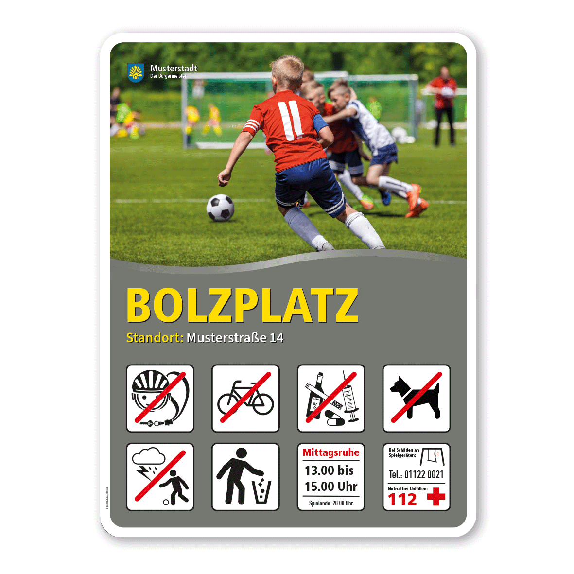 - Benötigen Sie unsere Bolzplatzschilder in größeren Mengen, mit wechselnden Standortangaben und Piktogrammen in Kombination weiterer Themenschilder, z.B. für Spielplätze, und andere Spiel- und Sportstätten, bitten wir um Ihre Anfrage. Gerne unterbreiten wir Ihnen ein Angebot mit angepassten Konditionen.